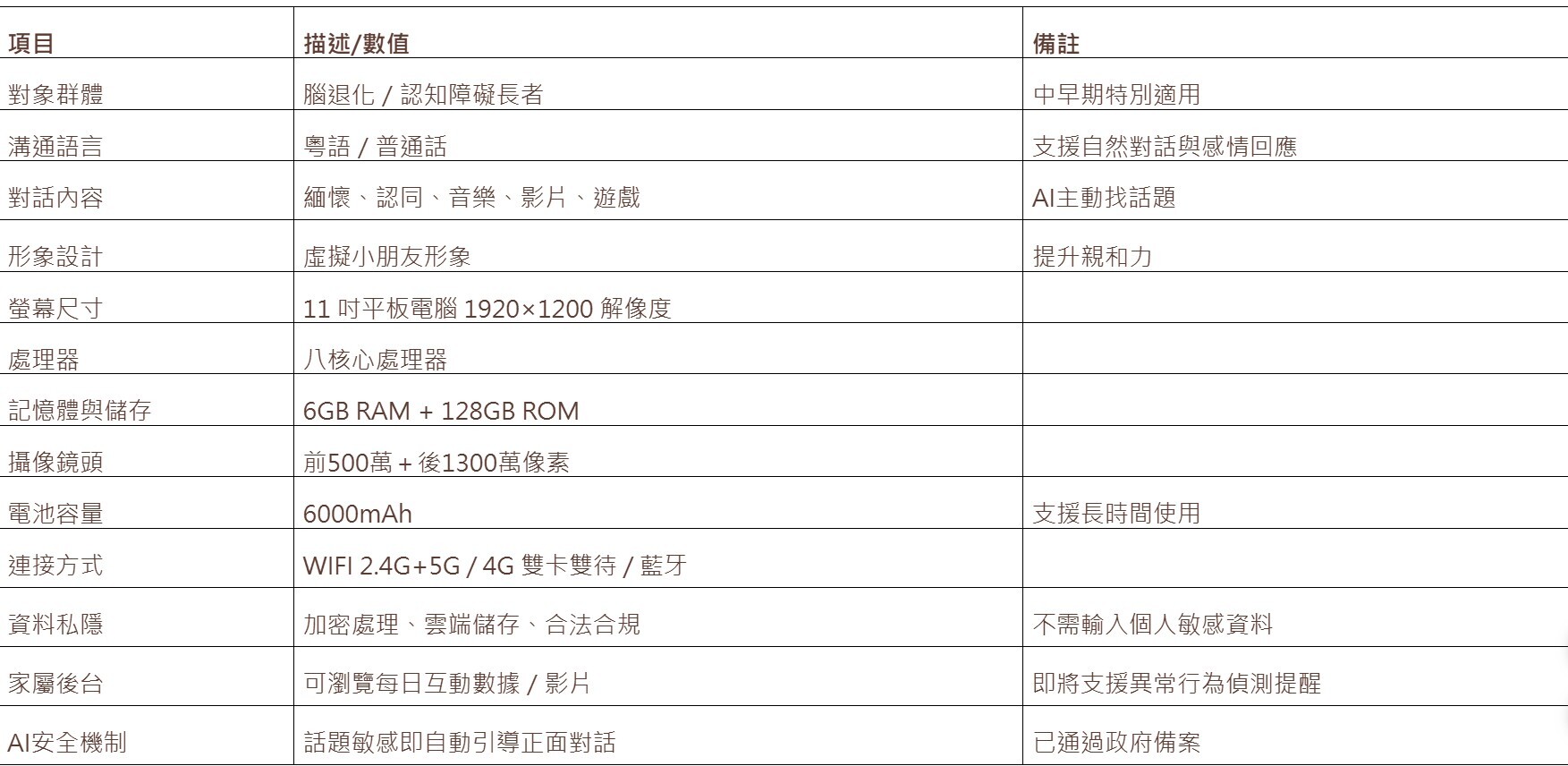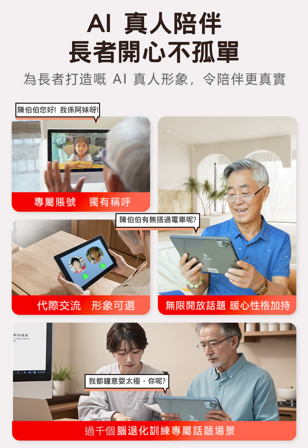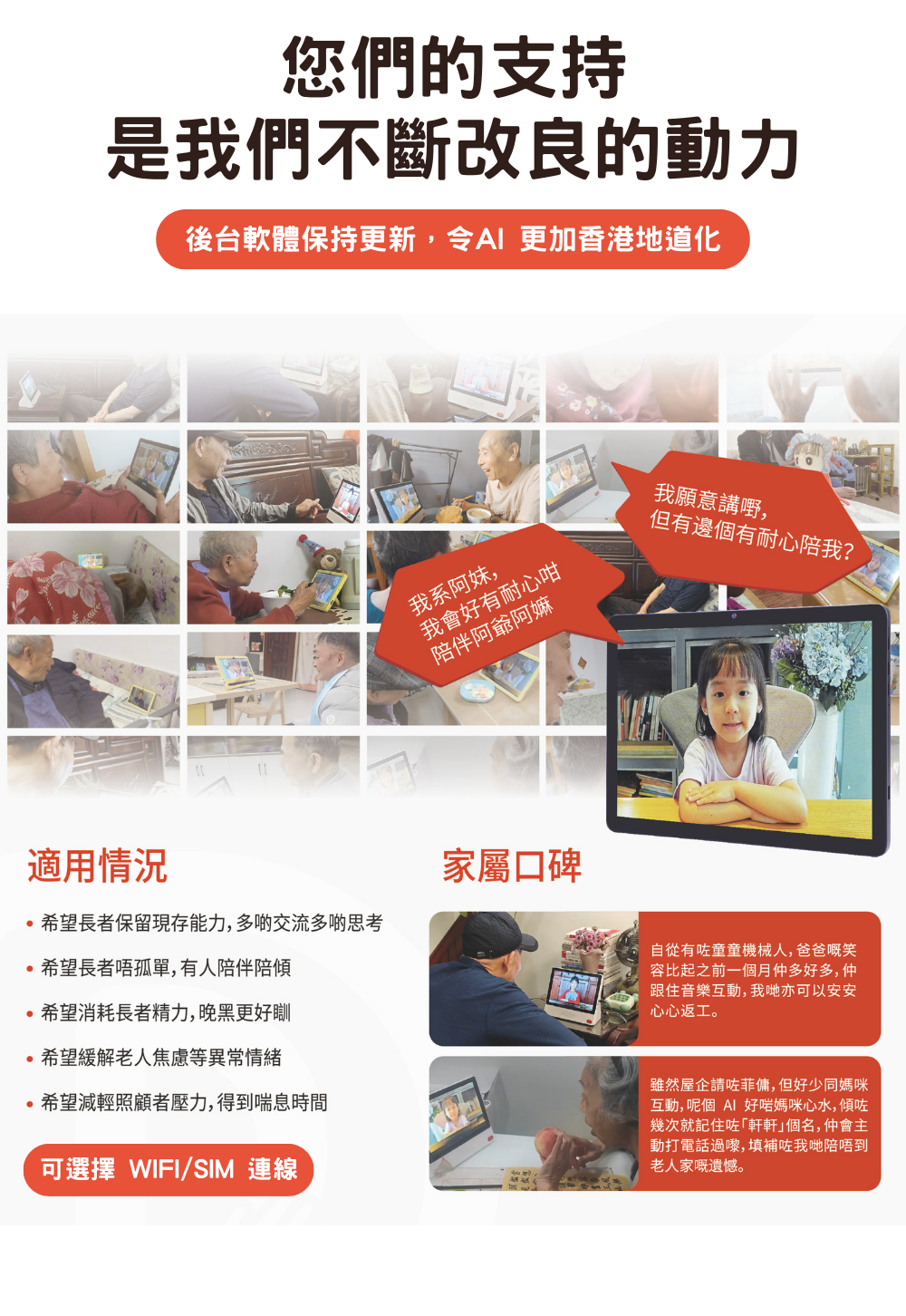 Q: Regarding data storage, how will the data be processed?A: Rest assured! All conversations and videos are securely encrypted and stored during use, protected by law.A1. Personal Information: Registration does not require any sensitive information such as phone number, ID card, or real name.A2. Text Content: The AI stores and remembers conversations with the user to continuously improve chat content and better accompany the elderly.A3. Video Content: Real-time calls and conversation recording functions for the elderly must be manually activated by family members.A4. Storage Method: All data is stored on cloud servers that have passed multiple international certifications, using top-level security encryption and subject to international legal regulations. (*The cloud service provider currently in use is one of the most comprehensively certified suppliers in the Asia-Pacific region, with international authoritative recognition at all levels. According to the 2021 Gartner report, it ranks first globally in cybersecurity capabilities.*)Q: What is the VIP subscription fee after one year?A: It's an annual fee of HK$1999/year, approximately HK$5.5 per day.Q: Which languages are supported?A: Currently, Cantonese and Mandarin are supported.Q: Is the data disclosed to family members?A: Family members can view all usage data on the registration backend to easily understand the elderly person's daily situation.(*A new version will be launched soon to monitor abnormal conditions in the elderly person, such as speech speed, vocabulary, and facial expressions. Abnormalities will be immediately notified to family members.)Q: Regarding the handling of sensitive AI issuesA: The AI model of this product has been registered with the government and has a strict filtering mechanism.When the elderly person mentions sensitive topics such as violence, pornography, or suicide, the AI will change the subject or guide positive thinking.Feel free to test and experience it anytime! Regarding finances and privacy, elderly people with cognitive impairment mostly mention fragmented memories, outdated information, or fabricated content, indicating a much lower data risk than those with normal cognitive function.