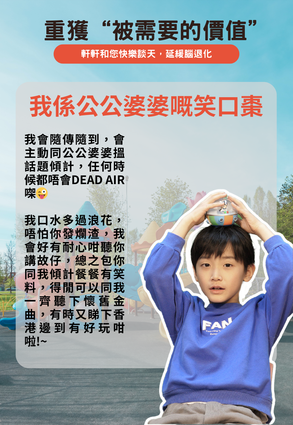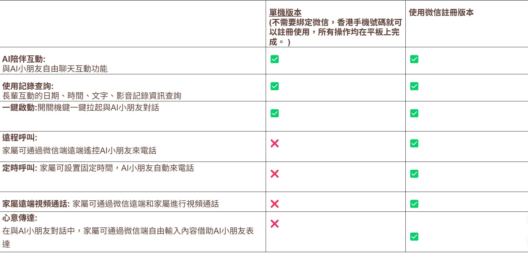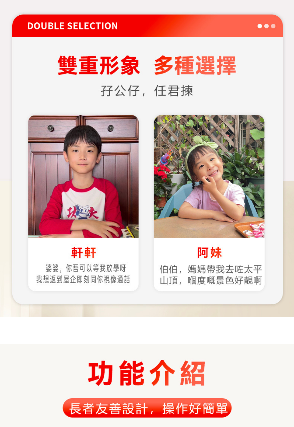 Q: Regarding data storage, how will the data be processed?A: Rest assured! All conversations and videos are securely encrypted and stored during use, protected by law.A1. Personal Information: Registration does not require any sensitive information such as phone number, ID card, or real name.A2. Text Content: The AI stores and remembers conversations with the user to continuously improve chat content and better accompany the elderly.A3. Video Content: Real-time calls and conversation recording functions for the elderly must be manually activated by family members.A4. Storage Method: All data is stored on cloud servers that have passed multiple international certifications, using top-level security encryption and subject to international legal regulations. (*The cloud service provider currently in use is one of the most comprehensively certified suppliers in the Asia-Pacific region, with international authoritative recognition at all levels. According to the 2021 Gartner report, it ranks first globally in cybersecurity capabilities.*)Q: What is the VIP subscription fee after one year?A: It's an annual fee of HK$1999/year, approximately HK$5.5 per day.Q: Which languages are supported?A: Currently, Cantonese and Mandarin are supported.Q: Is the data disclosed to family members?A: Family members can view all usage data on the registration backend to easily understand the elderly person's daily situation.(*A new version will be launched soon to monitor abnormal conditions in the elderly person, such as speech speed, vocabulary, and facial expressions. Abnormalities will be immediately notified to family members.)Q: Regarding the handling of sensitive AI issuesA: The AI model of this product has been registered with the government and has a strict filtering mechanism.When the elderly person mentions sensitive topics such as violence, pornography, or suicide, the AI will change the subject or guide positive thinking.Feel free to test and experience it anytime! Regarding finances and privacy, elderly people with cognitive impairment mostly mention fragmented memories, outdated information, or fabricated content, indicating a much lower data risk than those with normal cognitive function.