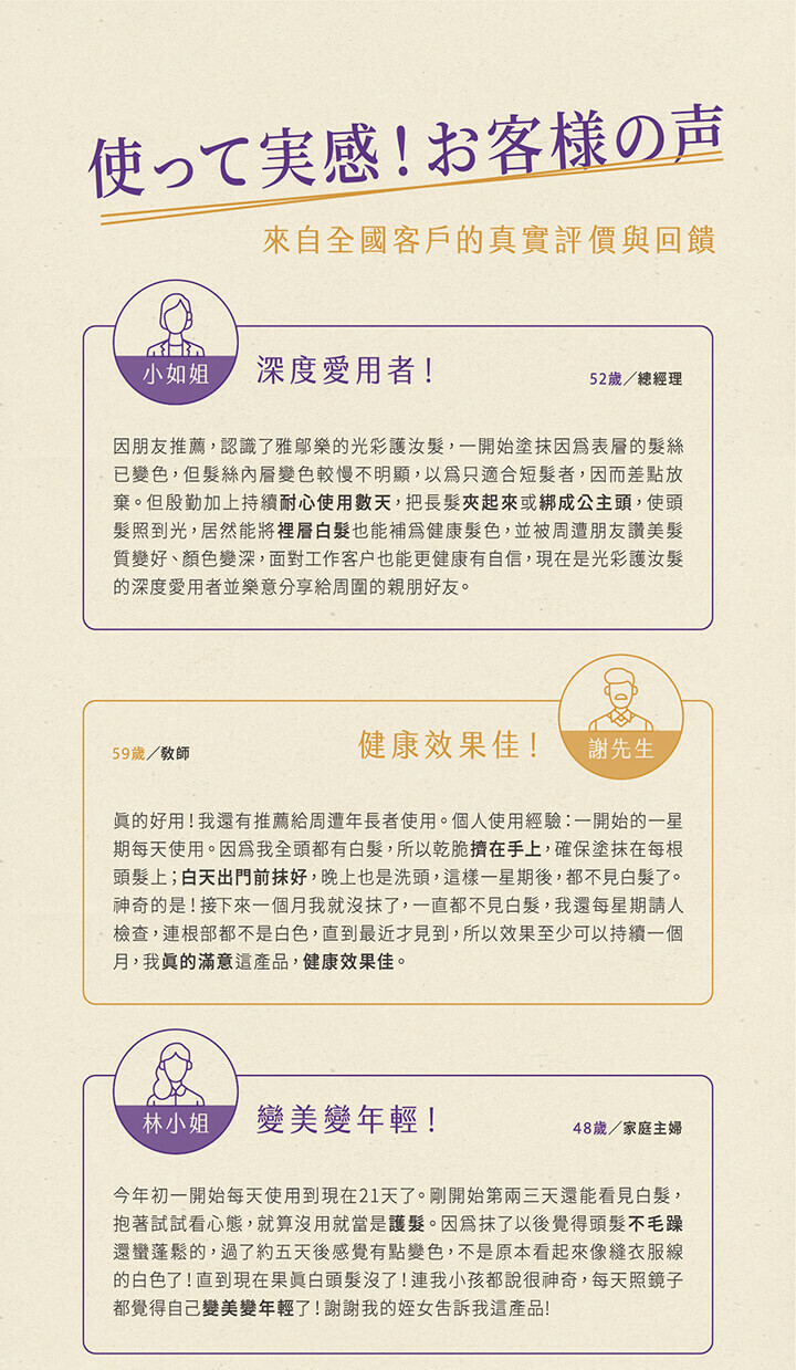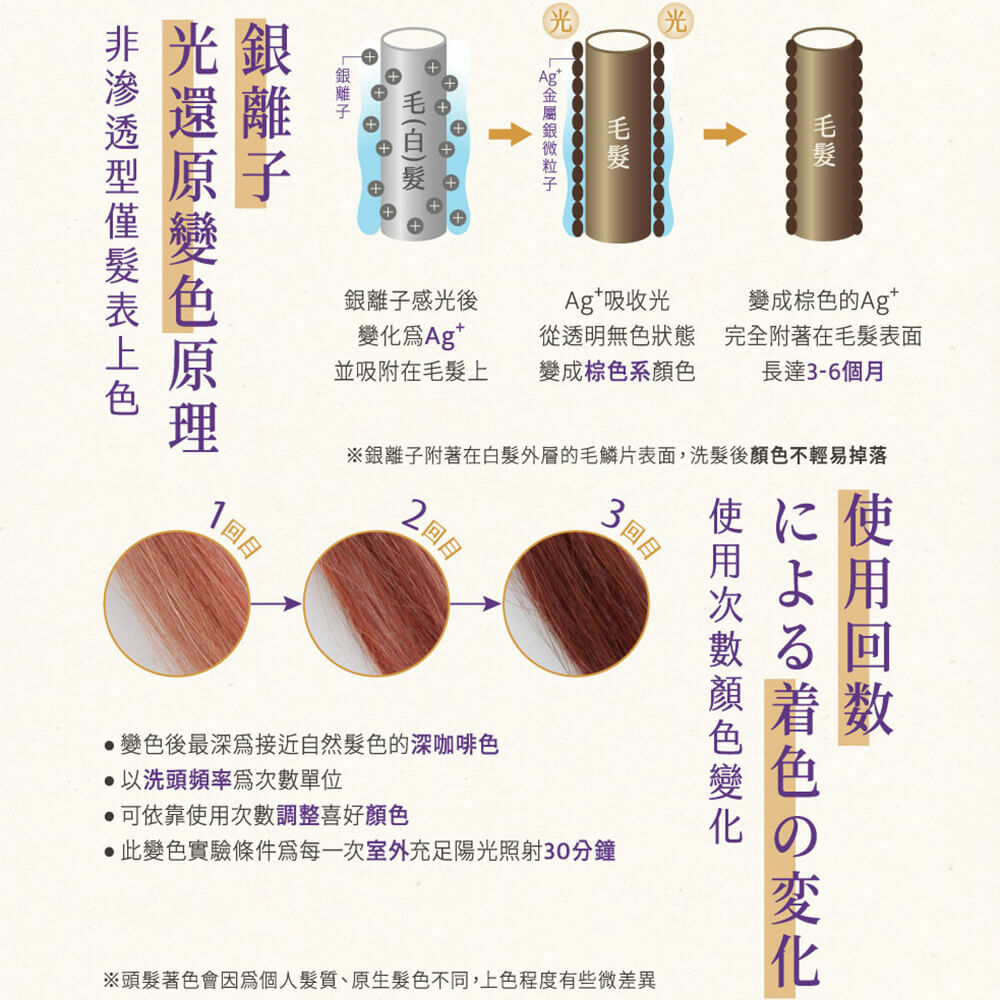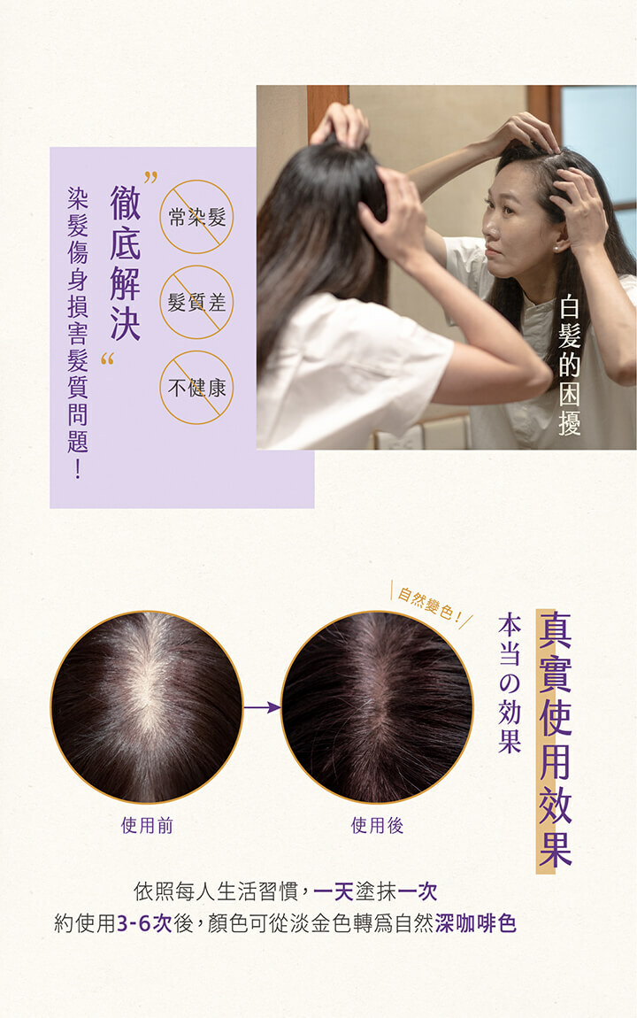 The product is originally a conditioner, so it doesn’t contain any chemical dyeing materials, and will not penetrate. It is not considered as a dyeing agent, it is just coverage coloring, so no matter pregnant or breastfeeding women in Japan use it. There is a large amount of customers in Taiwan with chronic diseases or allergic to dyeing agents, that are concerned with the health issues brought by application of chemical medications, who still chooses the conditioner over others. If for people with special physiques or still very worried, it is suggested to inquire a trustworthy doctor with the ingredients listed on the product.