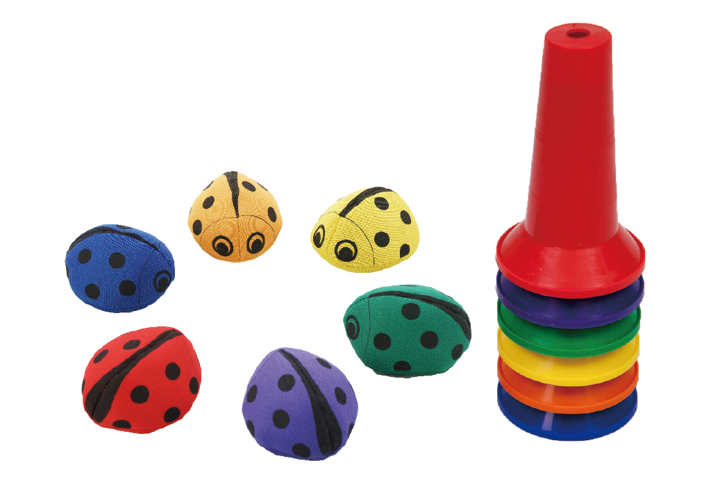 •拿起瓢蟲豆袋推向目標,擊中軟式標誌桶,無論站著或坐著,我們一起同享競賽的樂趣。