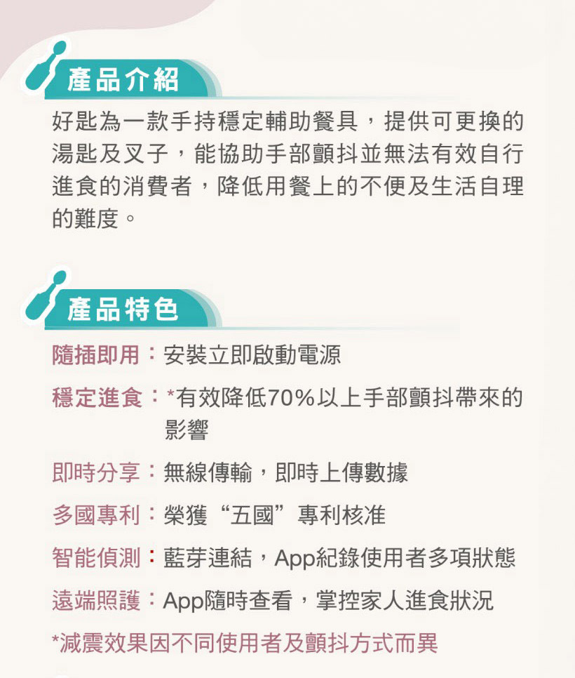 - 利用電子穩定手柄技術,有效降低70%以上手部顫抖帶來的影響。