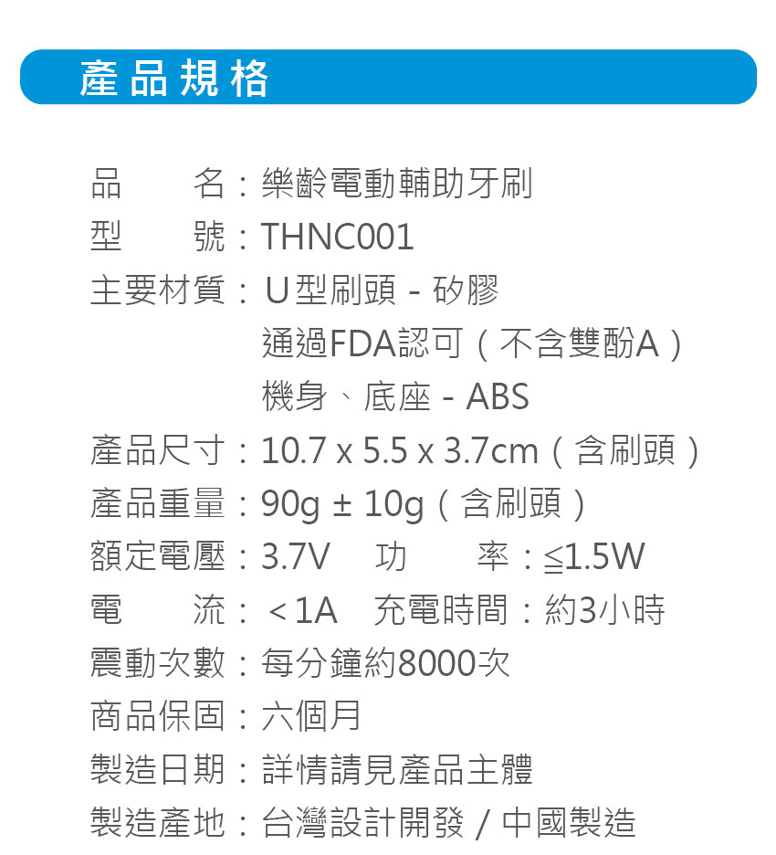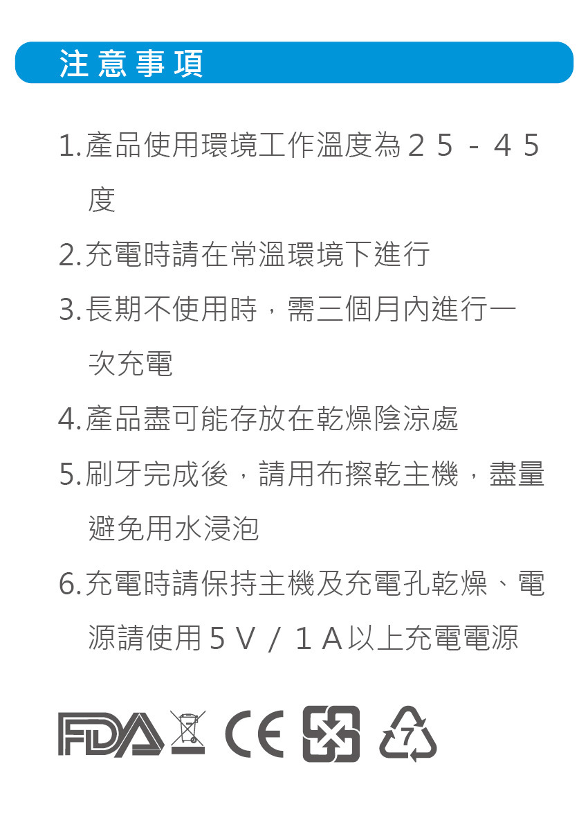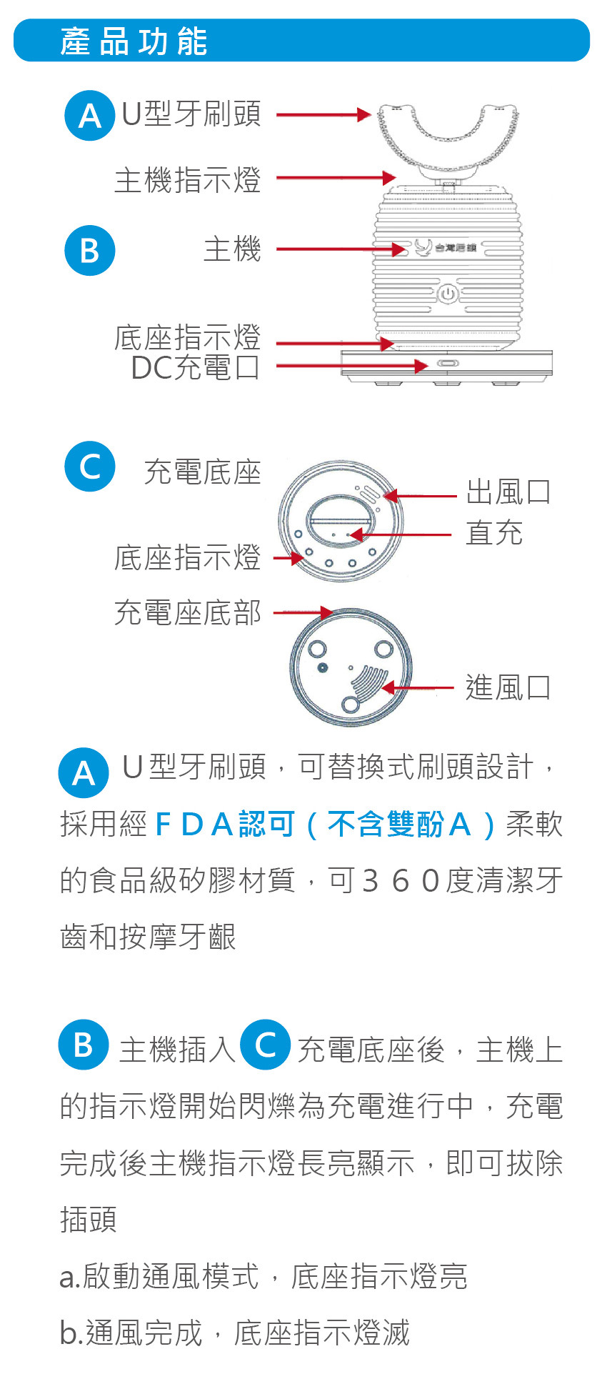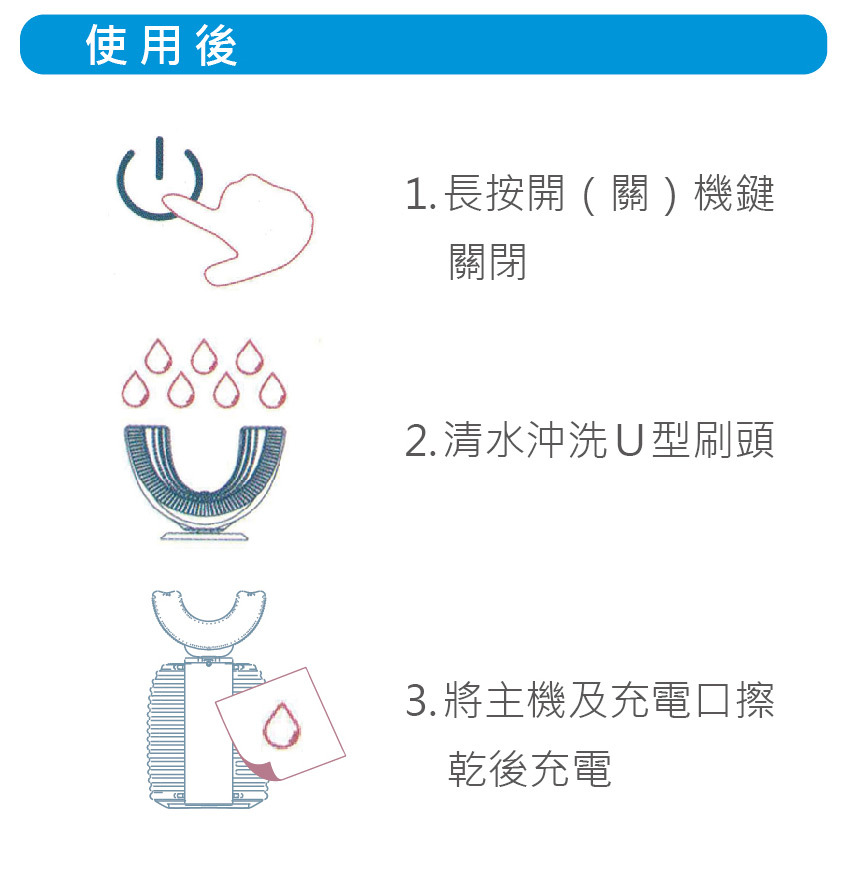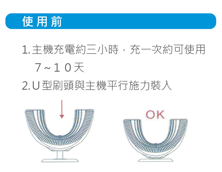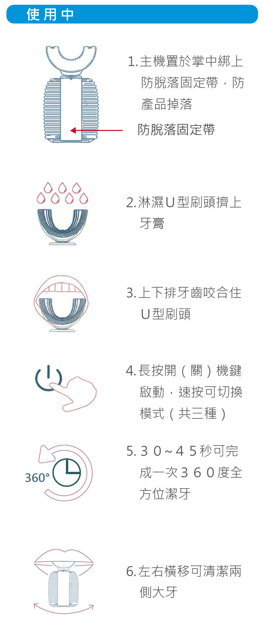 - U型刷頭設計,上下排牙齒咬住,30~45秒即可完成一回360度的潔牙