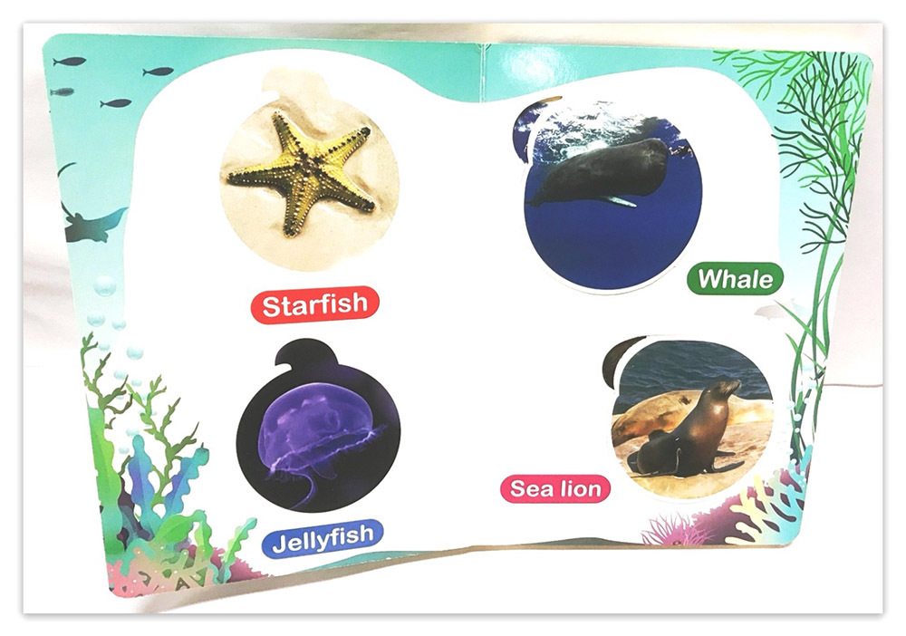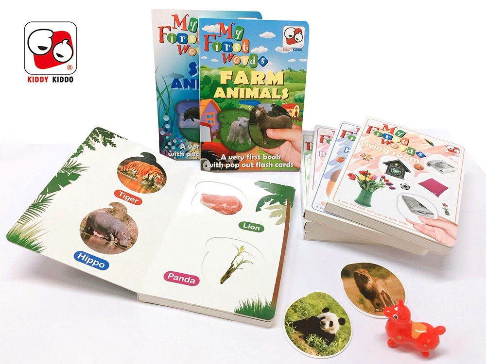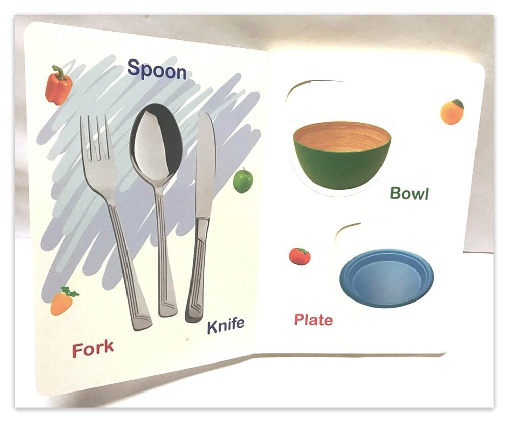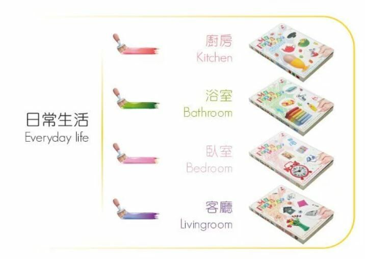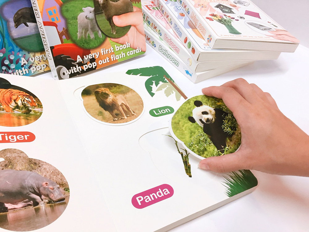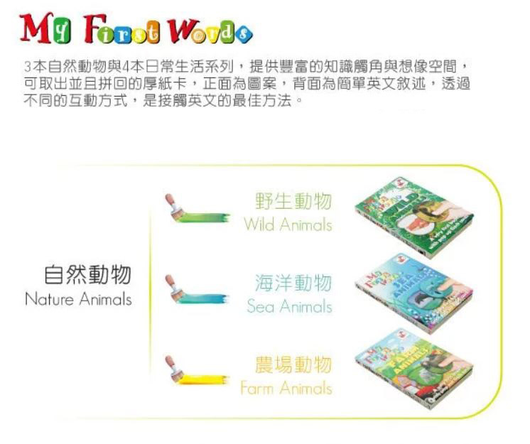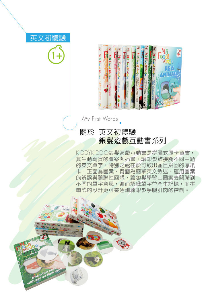 綺迪樂英文互動拼圖厚卡書,正面為圖案,在學習英文時,先以圖案來做單字的認知,並可以進行配對;而背面為英文例句,在認知建立後,再學習如何應用,加深對單字的記憶。