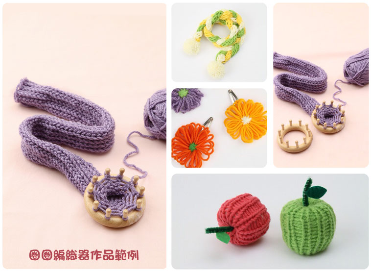 Three wooden knitting machines with different techniques and a demonstration of 12 different knitting projects.Join in the fun of knitting with the 12 different knitting techniques!