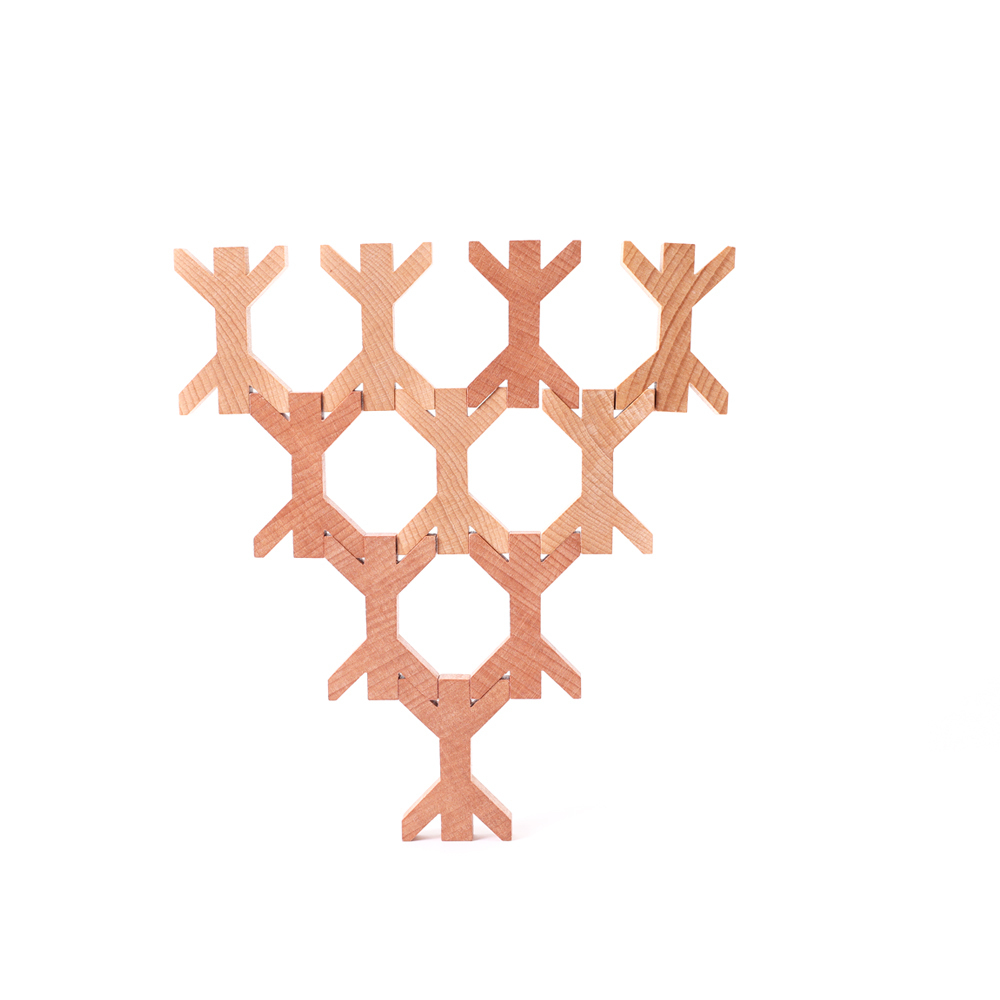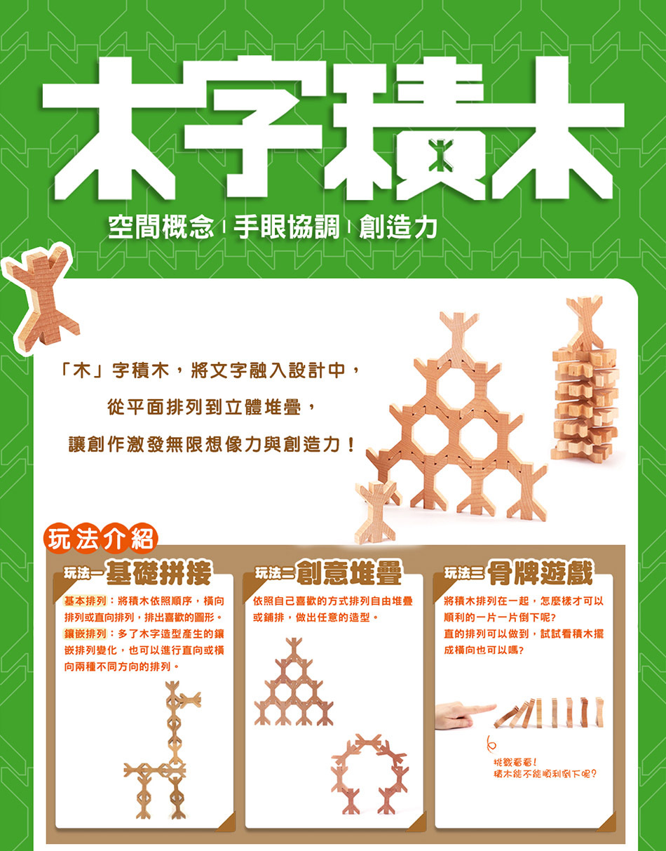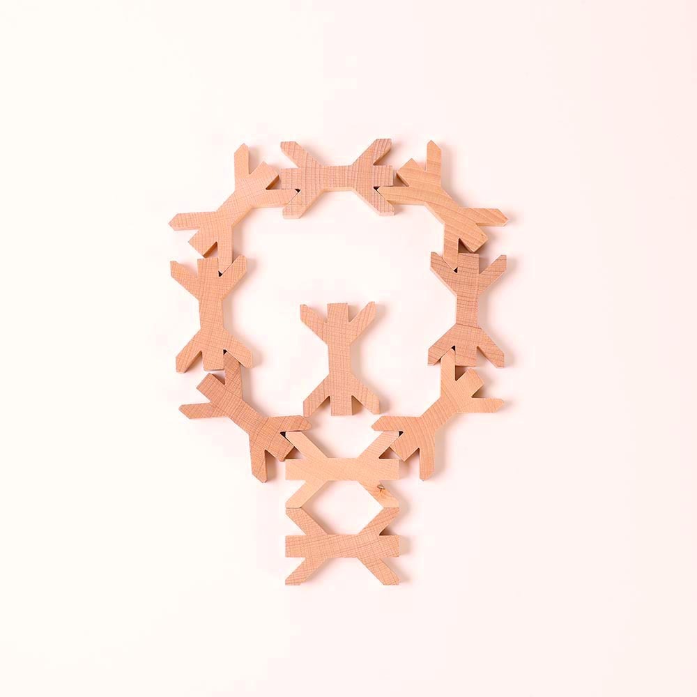The symmetrical shape of the Chinese character "木" (wood) is incorporated into the stacking blocks, designed with a special structure that allows for more possibilities in stacking.