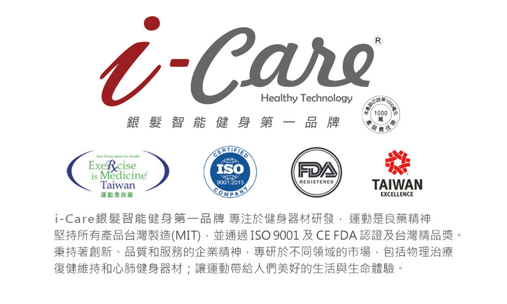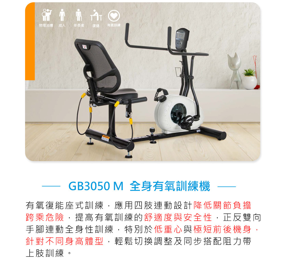 We recommend the specially designed 【i-Care】Silver Hair Exercise Series - Full Body Aerobic Training Machine GB3050. It applies a four-limb linkage design to reduce joint burden and the risk of accidents during aerobic training. The dual-directional hand and foot linkage allows for full-body training, with a focus on low center of gravity and an extremely short front and rear body design, making it easy to adjust for different heights and body types. It can also be used with resistance bands for upper limb training