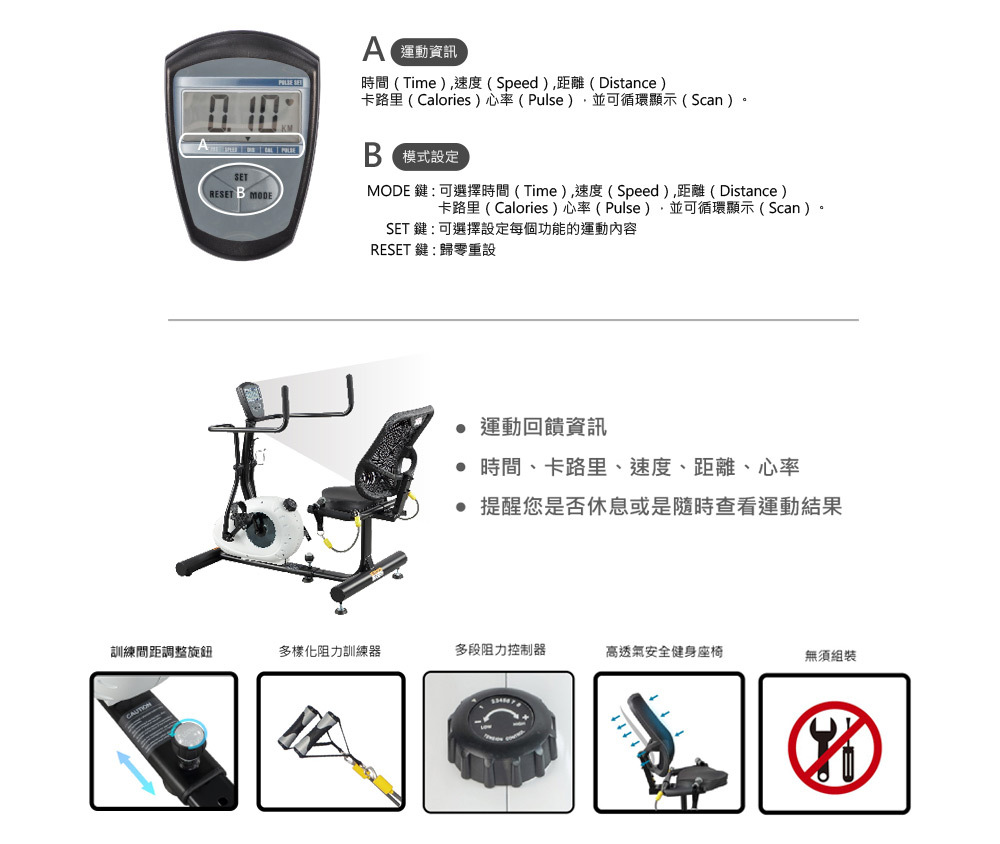 Designed for middle-aged and sub-healthy groups Aerobic recovery training in a seated position, reducing joint burden Dual-directional hand and foot linkage for full-body training, engaging the entire body Low center of gravity and extremely short front and rear body, suitable for different heights