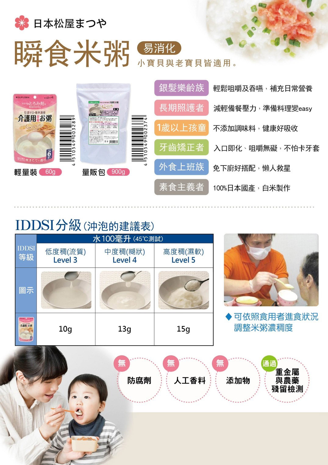 We recommend the [Matsuya] Japanese Niigata Instant Rice Porridge. This product is not only convenient and easy to prepare, but it also offers a customizable consistency to accommodate various eating conditions. Made from 100% Japanese white rice, the unique method of drying and grinding the rice into a powder preserves the original flavor and nutrients of the rice. Long-term caregivers can now breathe a sigh of relief as this product reduces the stress of meal preparation while providing a nutritious option for their elderly loved ones!