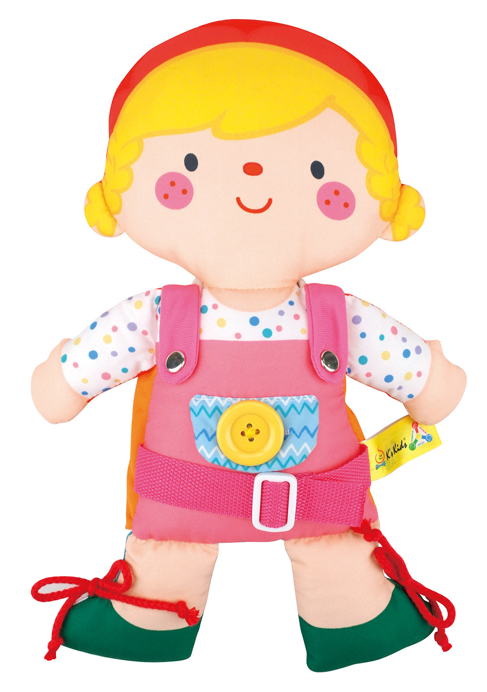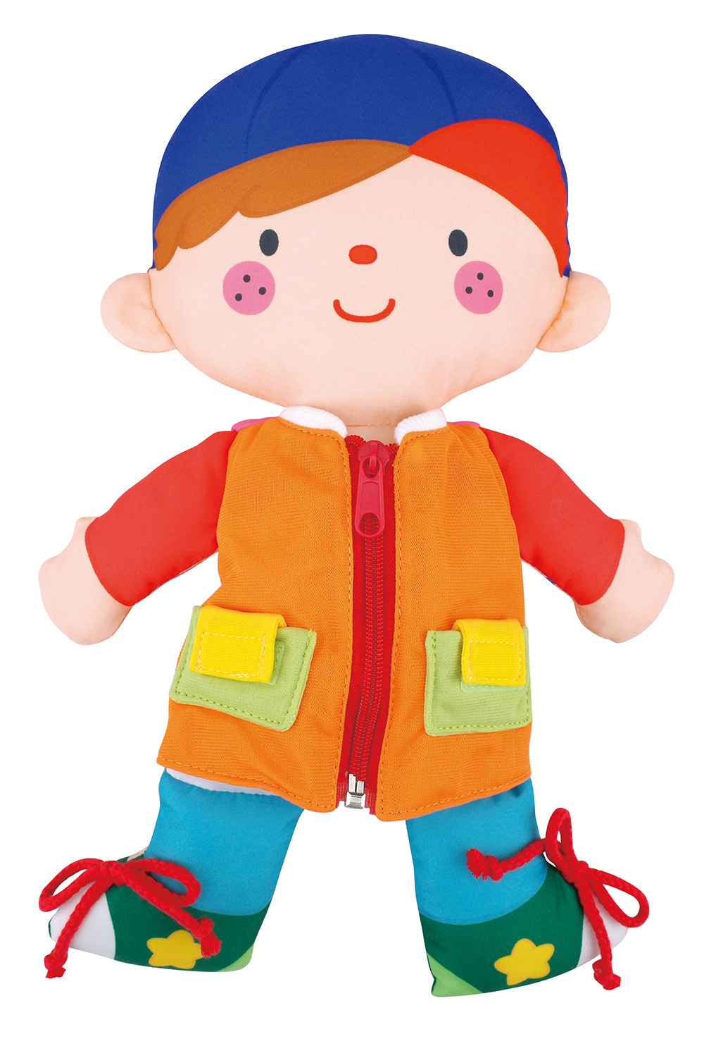 可愛的雙面布偶,一面是男生可學習拉拉鍊、綁鞋帶、拉魔鬼氈,一面是女生可學習扣扣子、繫皮帶等穿衣技巧。穿衣動作能訓練雙手協調能力和精細肌肉動作的靈巧度。