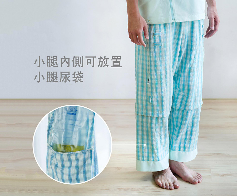 The patented design of the double arc three-headed zipper in the front extends to the knees on both sides, making it easy to put on and take off, convenient to observe urine wetness, catheter care, male urinal operation, and stable continuation of the urinary catheter. The hidden pocket on the right pant leg can hold male urinal bags, leg bags, and large urine bags for emptying. This style has an adjustable waistband.