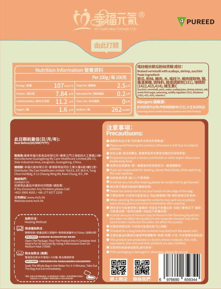成份:水,節瓜,粉絲,瑤柱汁(水,鹽,增味劑(E621,E635),調味劑(含有甲殼類動物,魚,含有麩質的榖類),糖,改性澱粉,植物油,水解植物蛋白,瑤柱粉(含有軟體動物),穩定劑(E415),酸度調節劑(E330),色素(E160a)),蝦米,食用鹽,酵母提取物,增味劑(621),增稠劑(1442,415),抗氧化劑(維生素C,331)