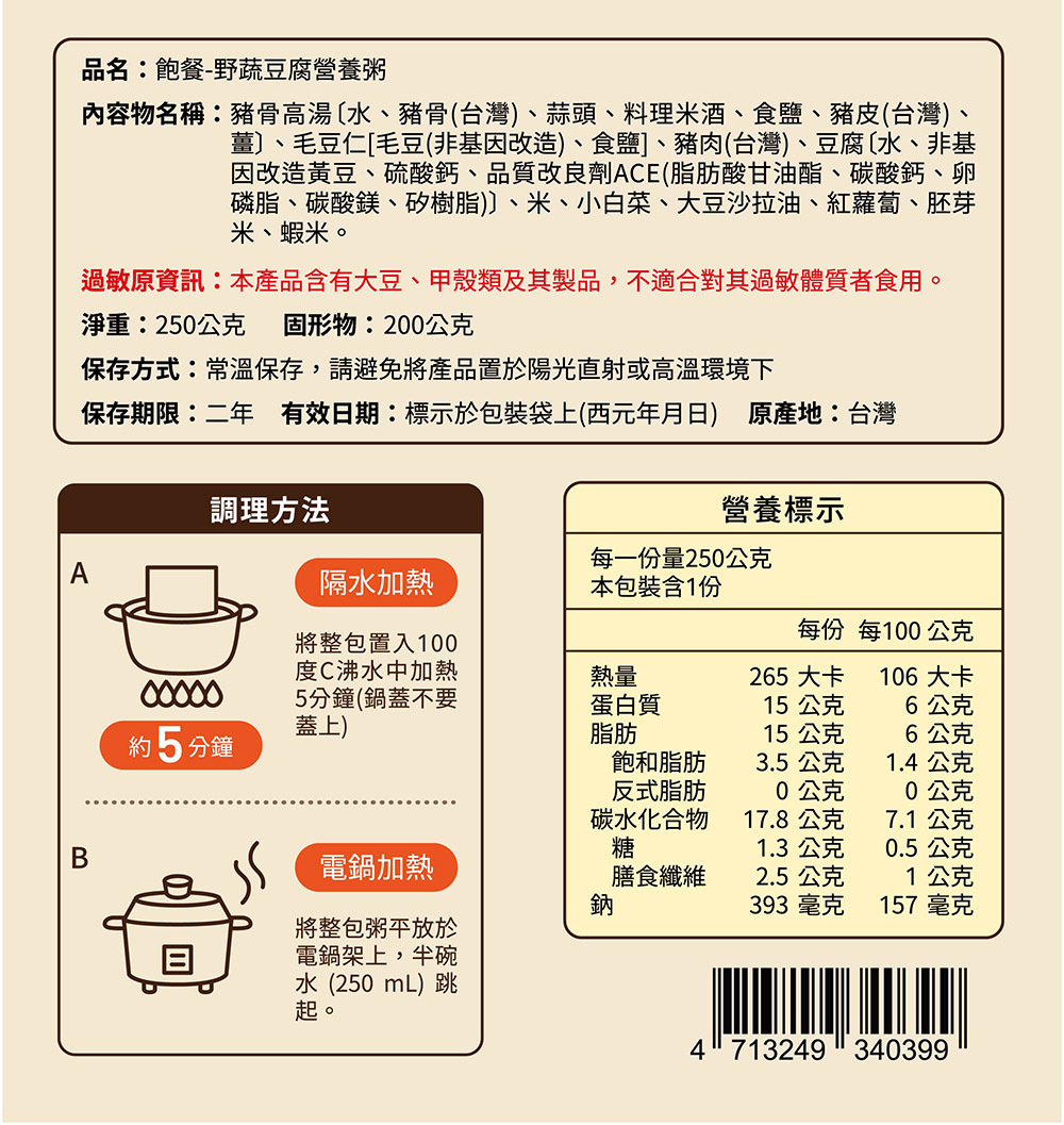 3. 成分:豬骨高湯〔水、豬骨(台灣)、蒜頭、料理米酒、食鹽、豬皮(台灣)、薑〕、毛豆仁[毛豆(非基因改造)、食鹽]、豬肉(台灣)、豆腐〔水、非基因改造黃豆、硫酸鈣、品質改良劑ACE(脂肪酸甘油酯、碳酸鈣、卵磷脂、碳酸鎂、矽樹脂)〕、米、小白菜、大豆沙拉油、紅蘿蔔、胚芽米、蝦米。