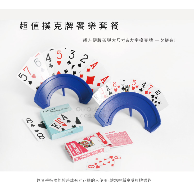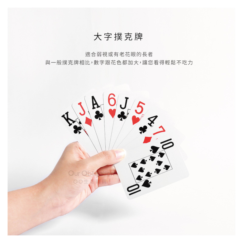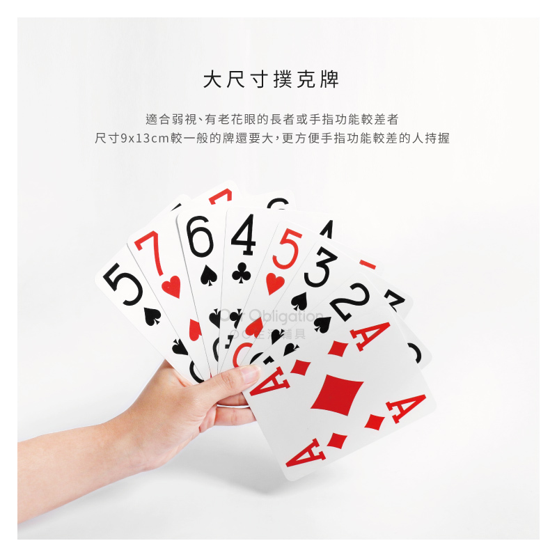 【OO生活輔具】超值撲克牌饗樂套餐,專為銀髮族打造!大尺寸設計,握起來輕鬆省力,大字體印刷,清晰明亮不傷眼,無論是家庭娛樂還是益智活動,都更貼心、更便利。讓長輩也能輕鬆參與撲克牌遊戲,享受與家人好友共享的美好時光!實用又樂趣無窮,給他們一份真正體貼的關懷。