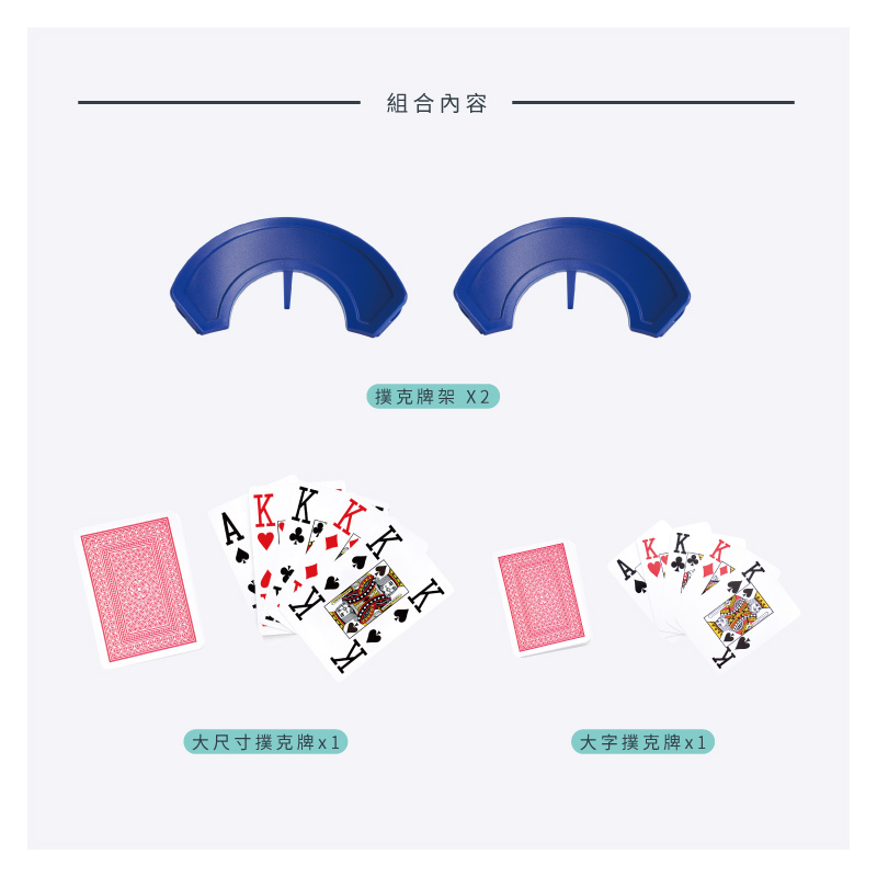 3. 產品內容:撲克牌架×2 + 大尺寸撲克牌×1 + 大字撲克牌×1