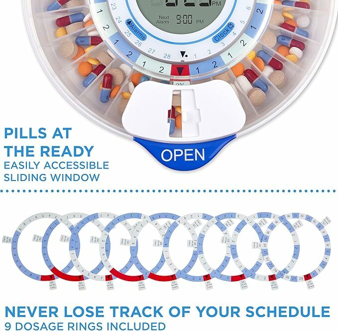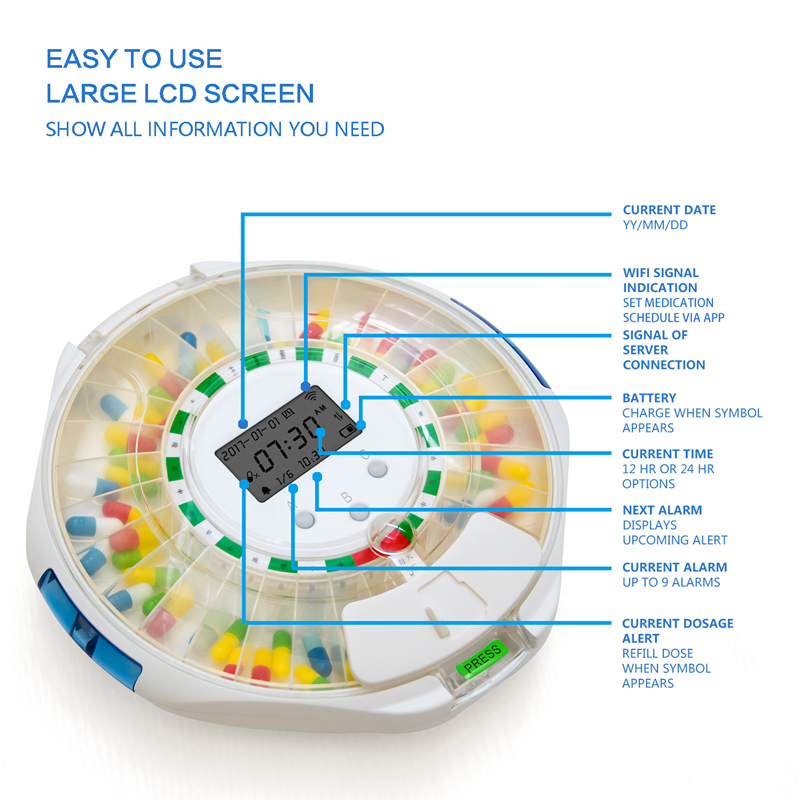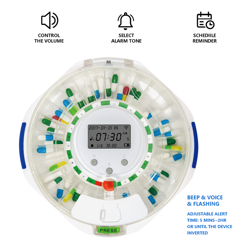 服藥定時分配裝置會自動提醒使用者服藥時間,直至用家打開小蓋子將藥倒出。