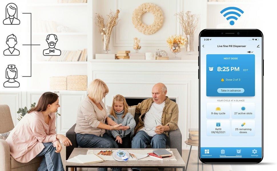 當到服藥時間會透過WIFI通知家人手機及閃燈加鳴響警示三重提醒功能。