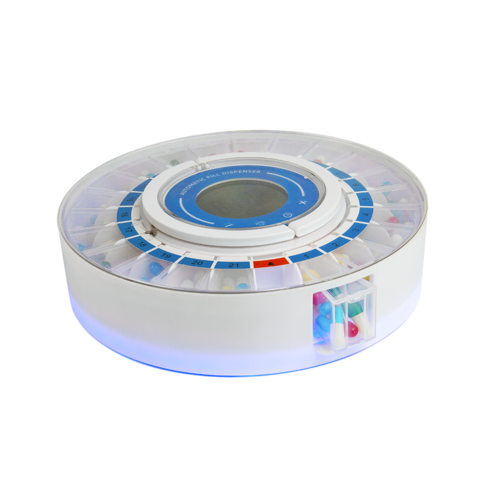 服藥定時分配裝置會自動提醒使用者服藥時間,直至用家打開小蓋子將藥倒出。