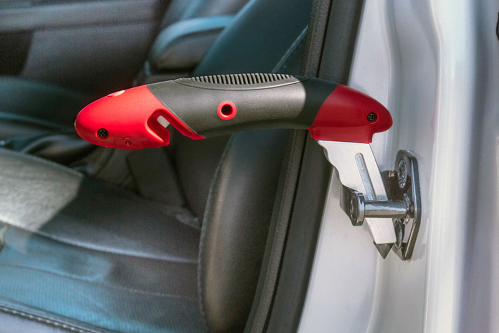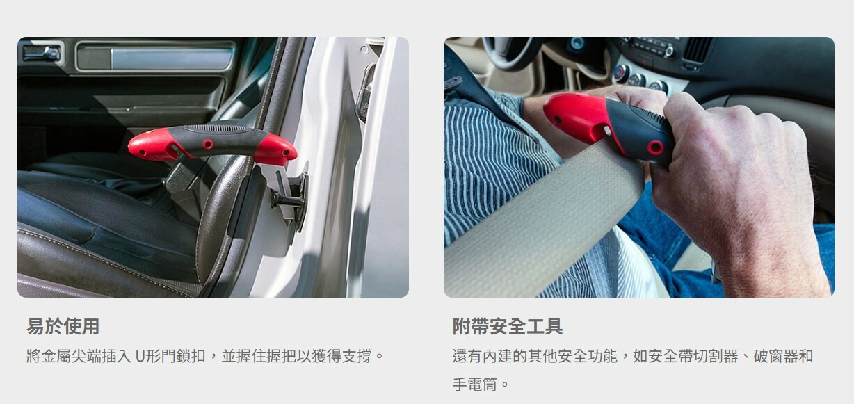 4. 附加安全工具:除了可作為車用輔助扶手,還具備安全帶切割器、破窗器和緊急手電筒等功能。