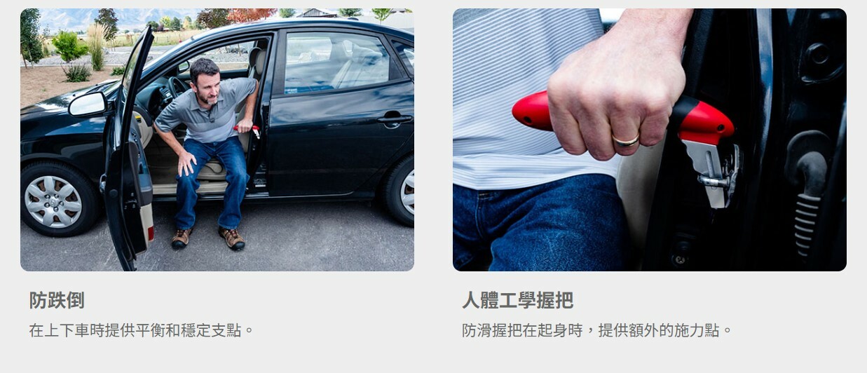 上下車輔助安全握把提供穩定可靠的協助,在任何車輛上都能安心地起身下車。無論是提供車子的水平或是垂直支撐,它能為您增加最適合施力的支撐點,引導您順利起身。