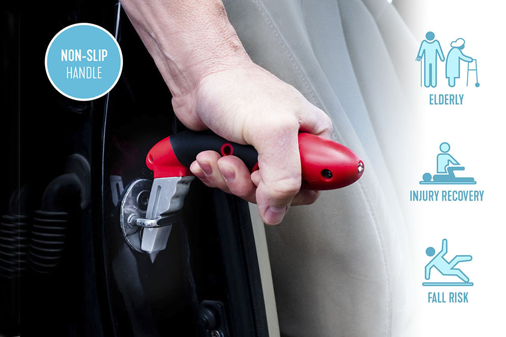Stander 的 上下車輔助安全握把 是汽車安全工具!協助使用者在進出車輛時、能夠輕鬆安全地上車入座或起身下車,提供支撐力並防範失衡跌倒。附加功能如安全帶切割器和破窗器,使其成為汽車安全和支持長者平穩上下車的全方位解決方案。