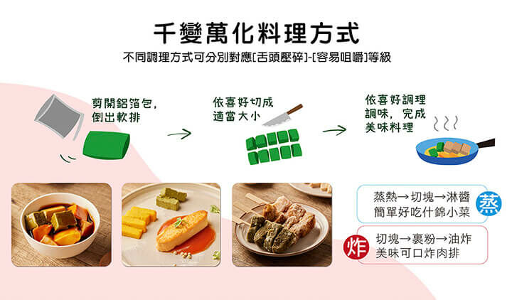U+優加 適合咀嚼吞嚥困難障礙者食用,可依需求切成各種尺寸,