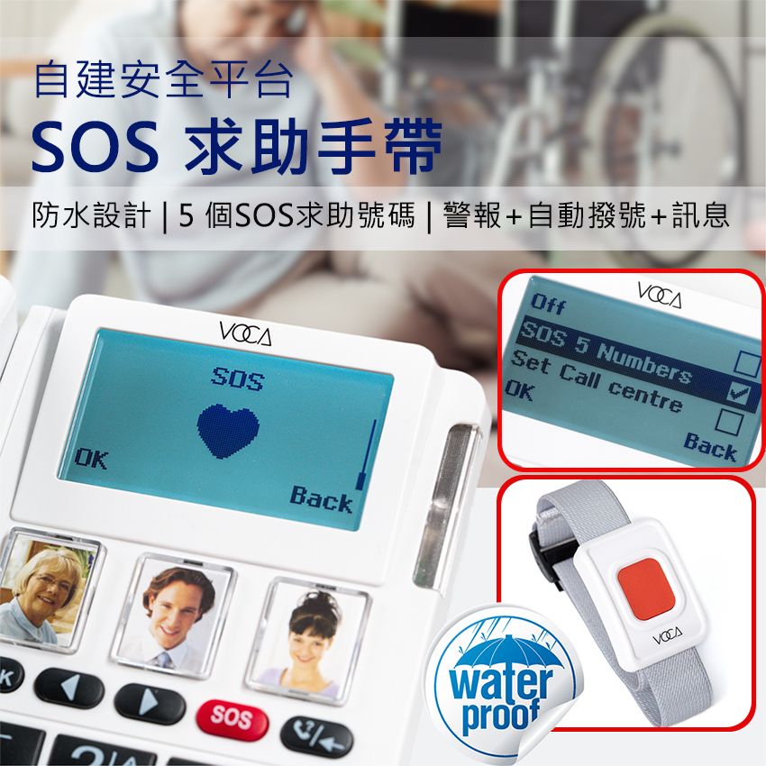 Equipped with waterproof SOS wristband | 5 SOS contact numbers | Safety alarm function (voice dialing + help message)