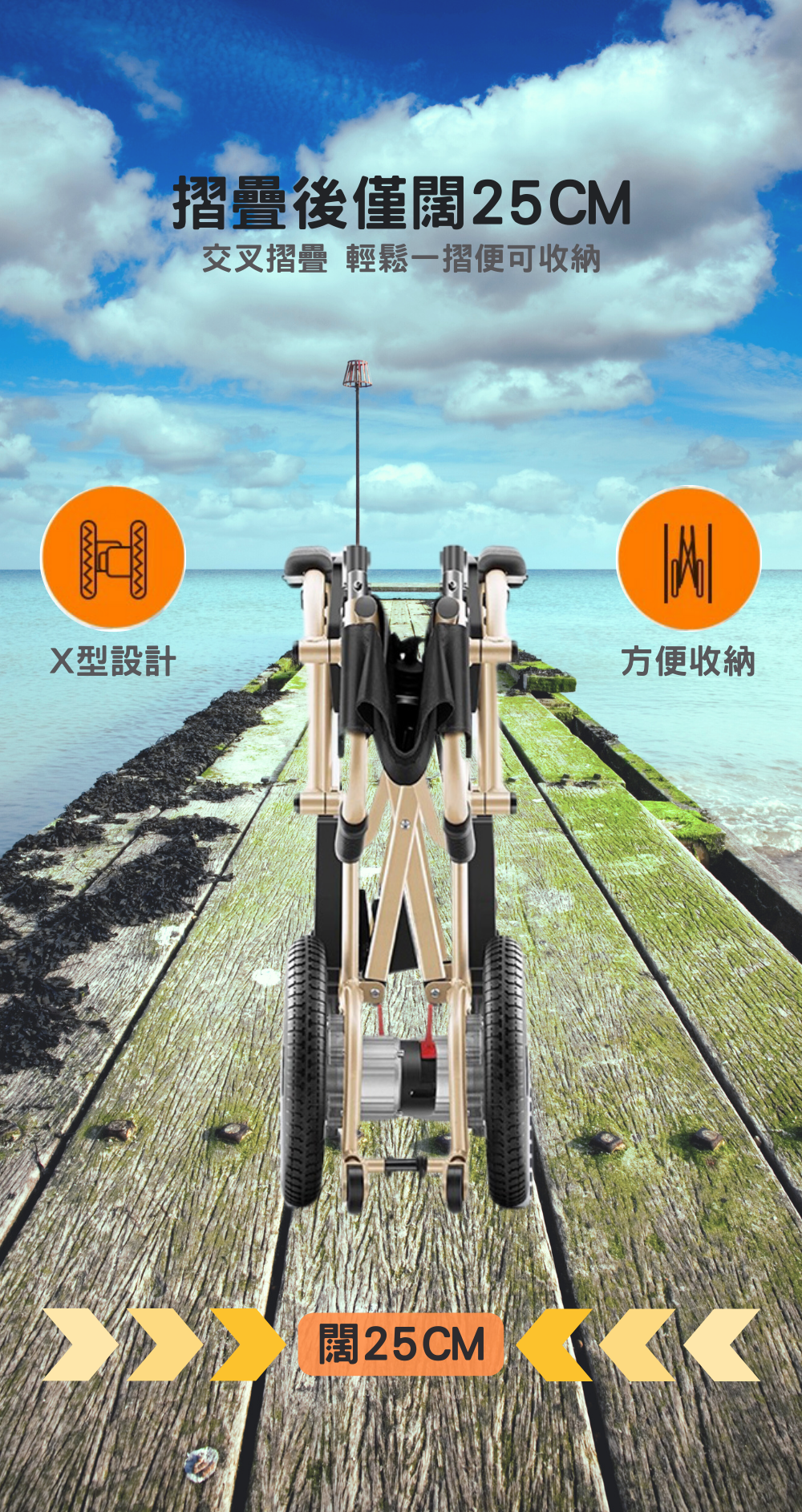 ● 車架採用鋁合金,可以上飛機,易摺疊,摺疊後,可放車尾箱。