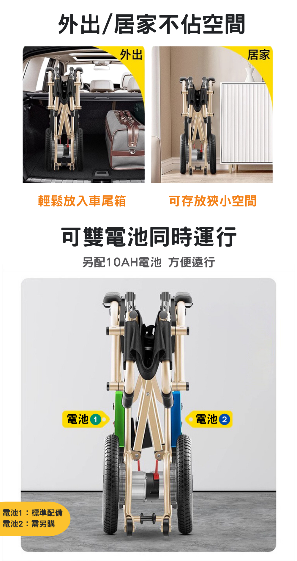 ● 配備1或2顆10A鋰電池,每顆可行駛約13~18公里。