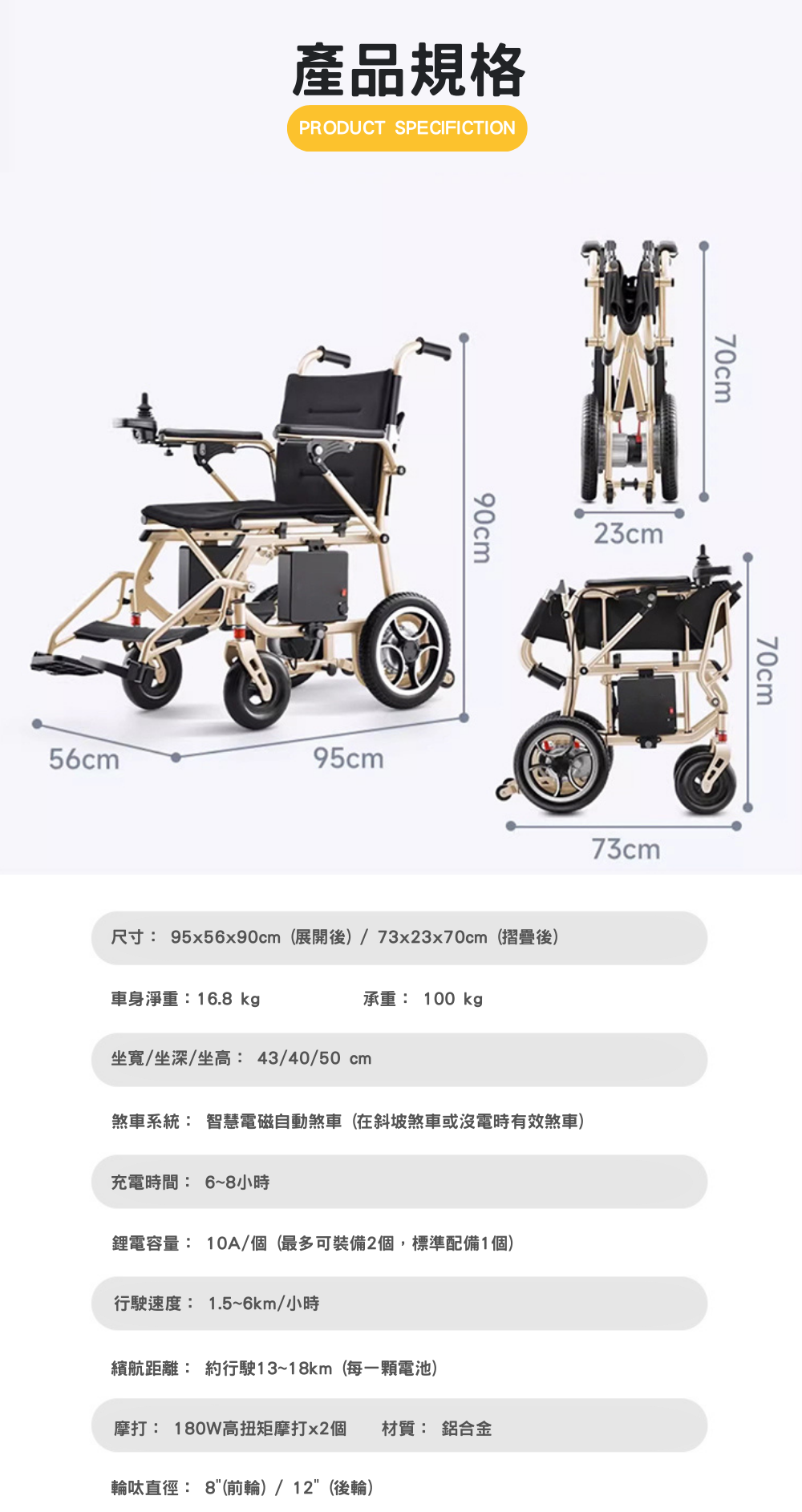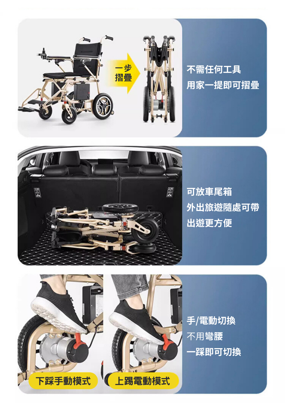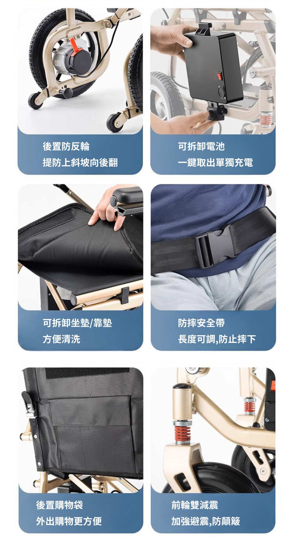 ● 整車配有防後翻設計,防止輪椅後翻,上斜更安全。