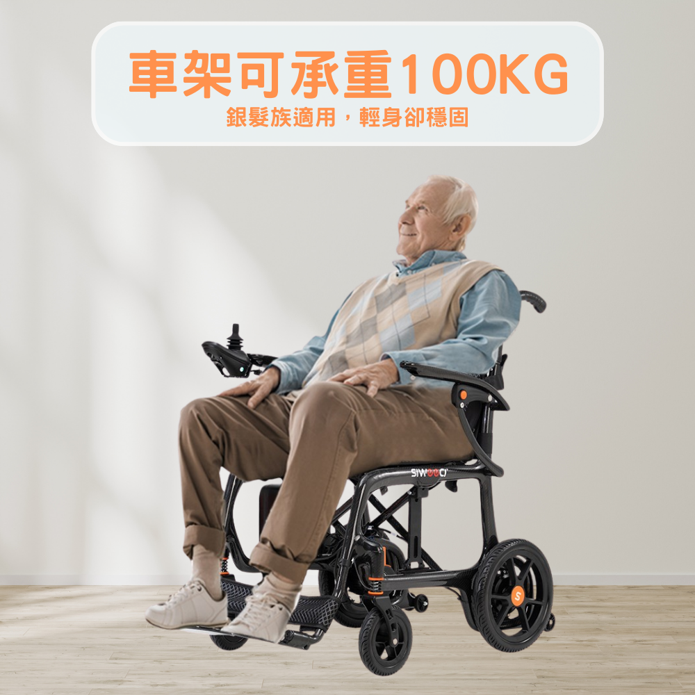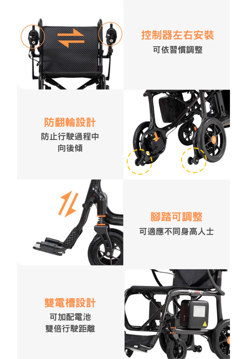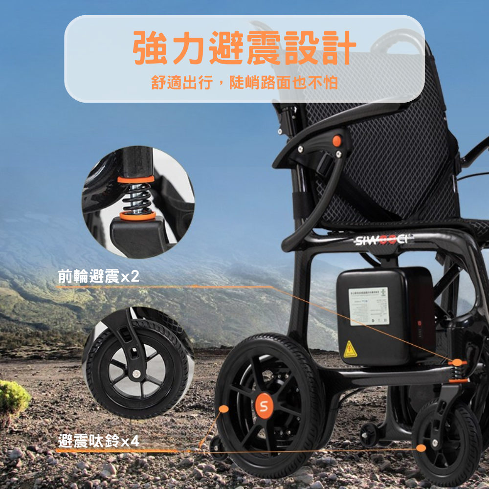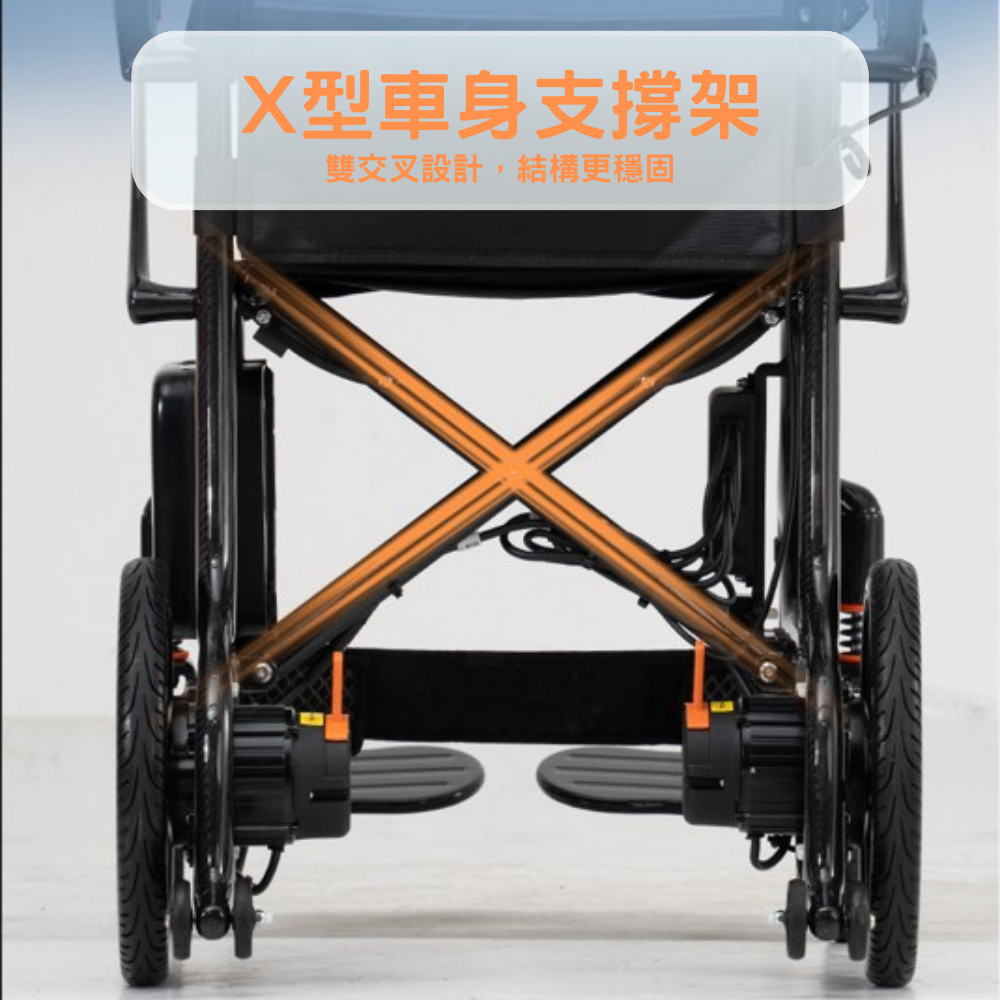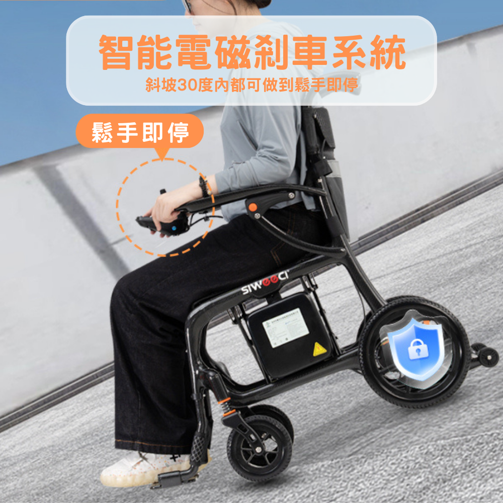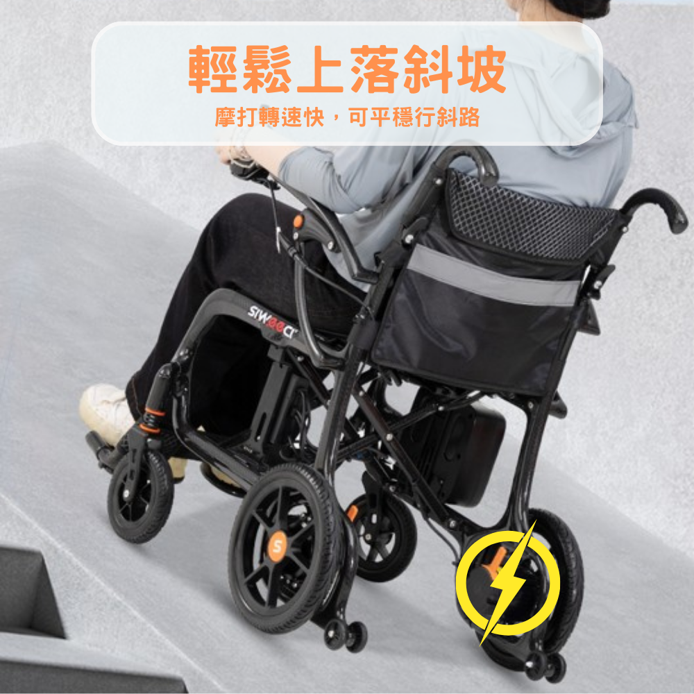 ● 整車配有防後翻設計,防止輪椅後翻,上斜更安全。