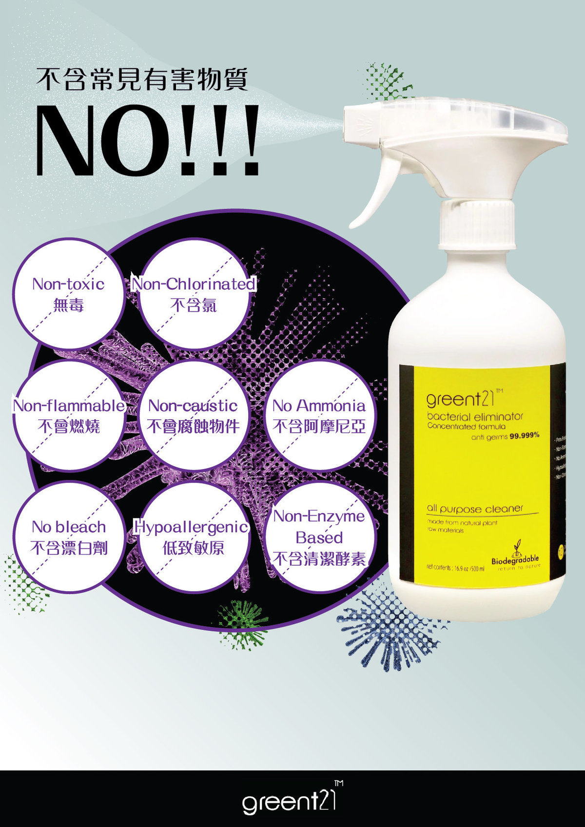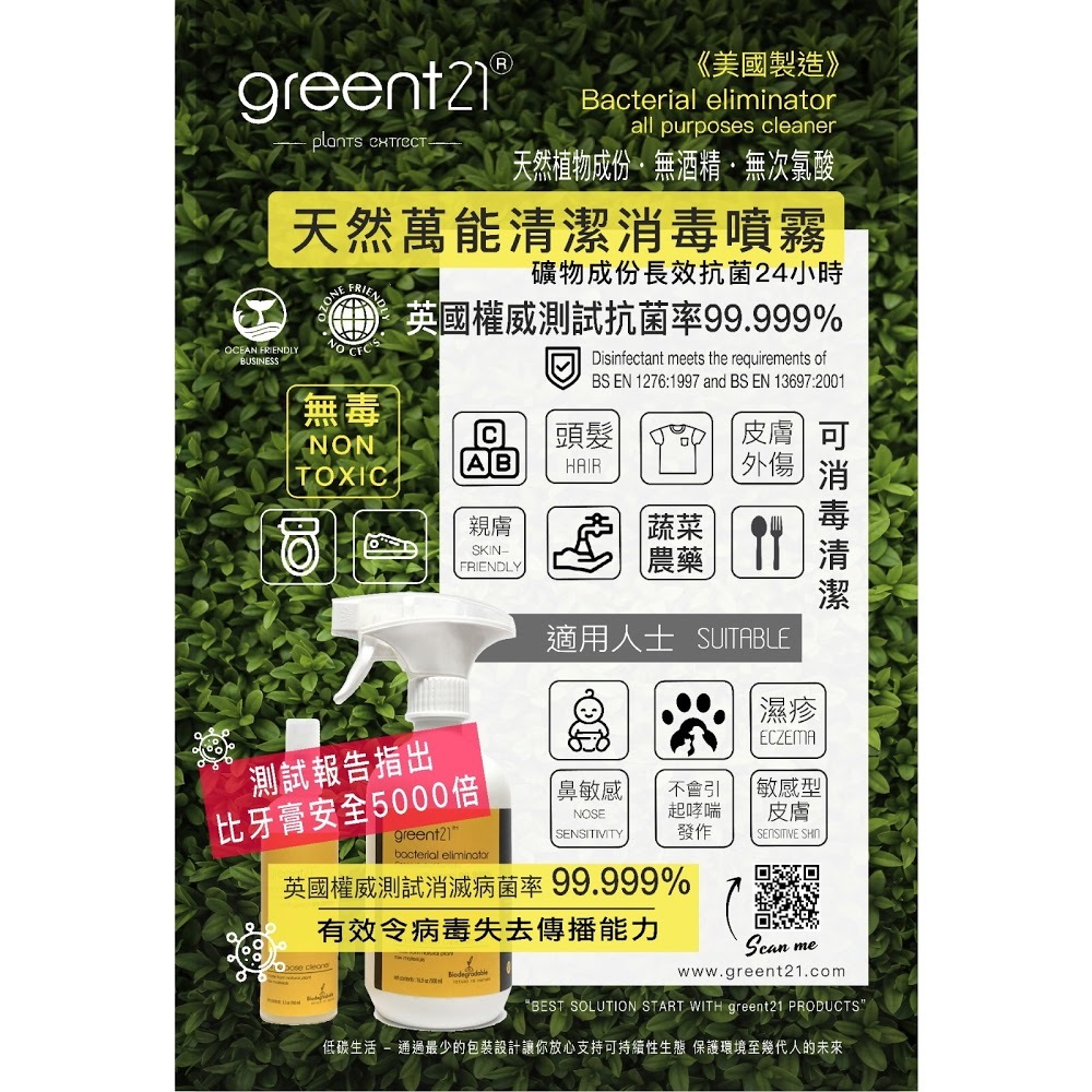GreenT21經英國醫學權威測試 抗菌率達99.999%,能去除大部分常見細菌、真菌及最難除的芽孢菌,符合歐盟消毒除菌劑標準EN1276