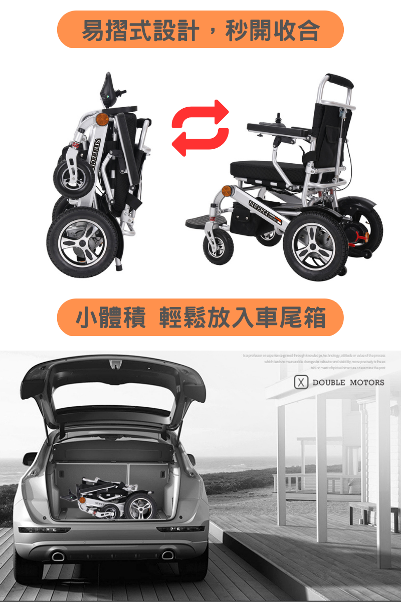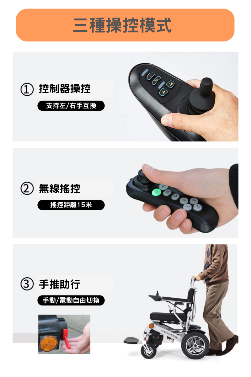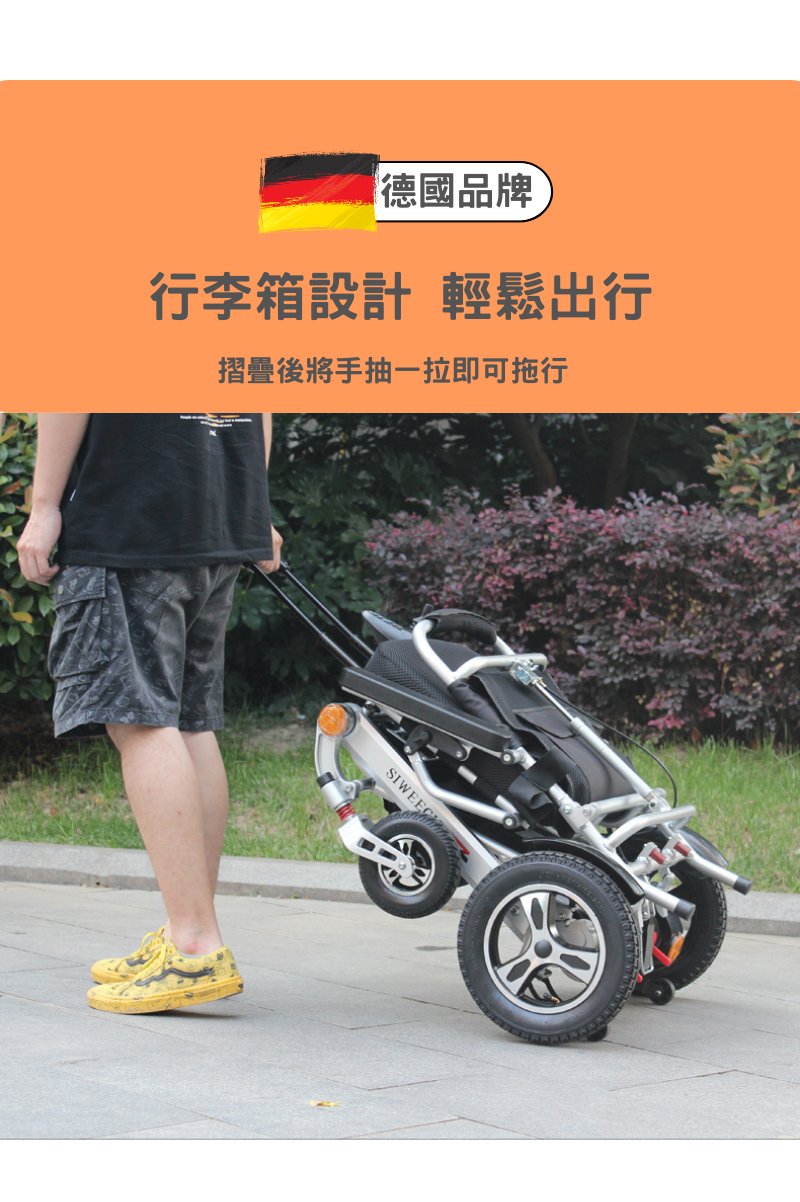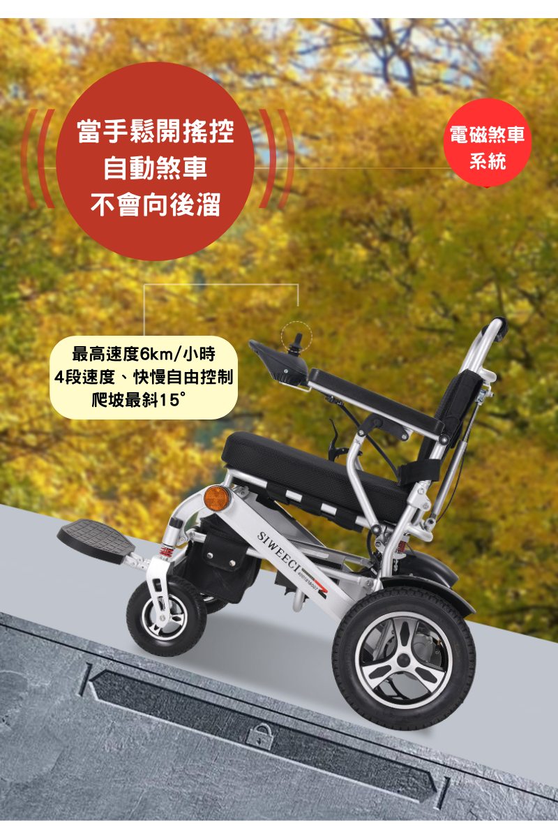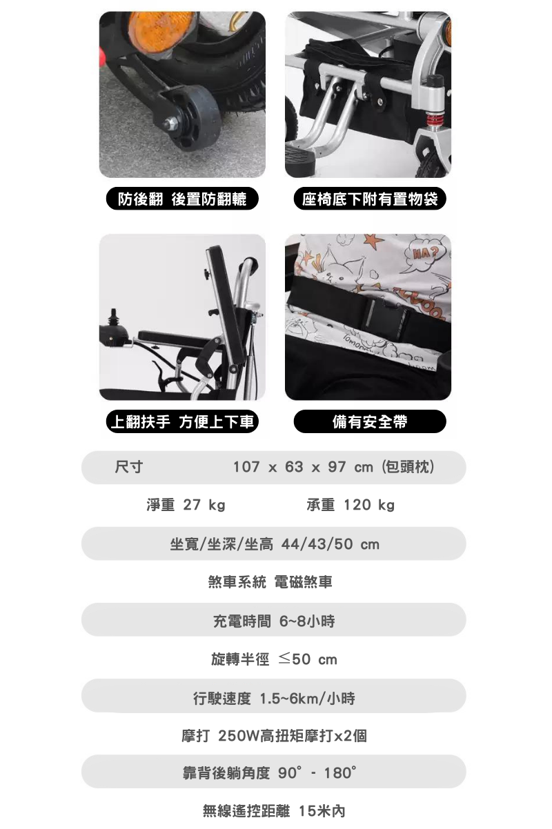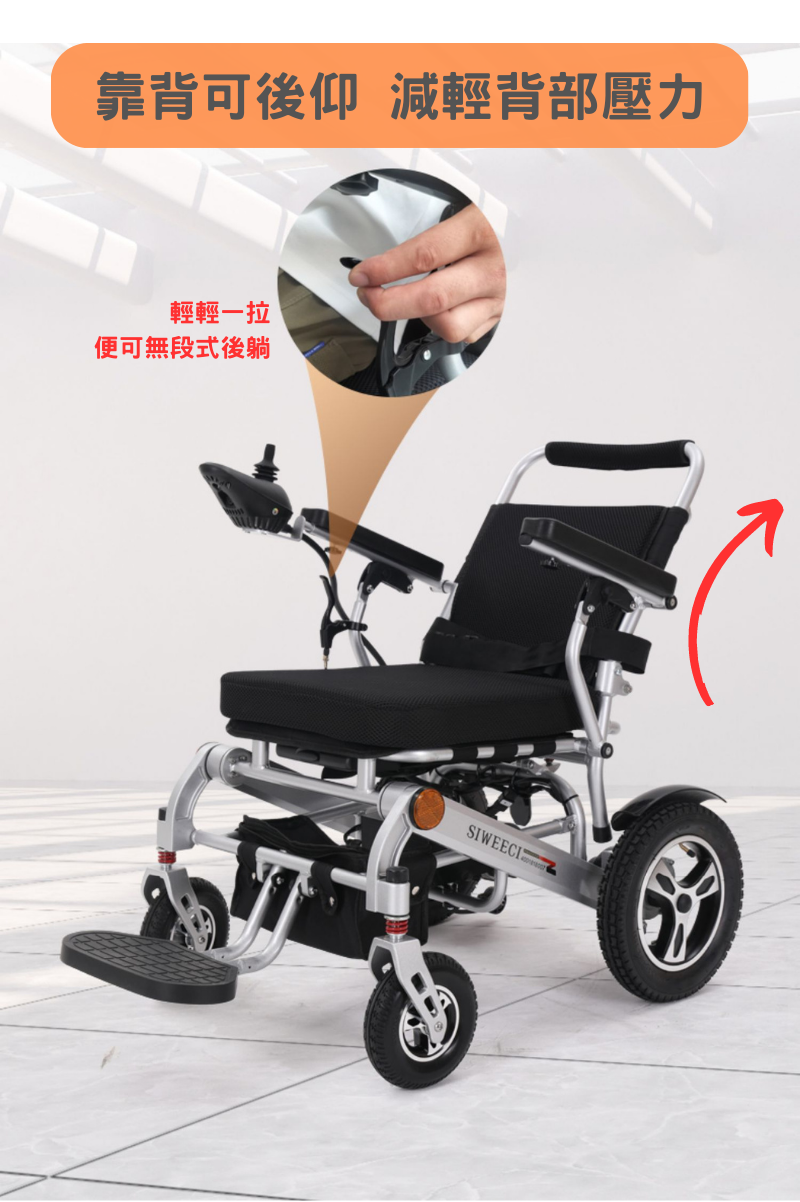 ● 整車配有防後翻設計,防止輪椅後翻,上斜更安全。