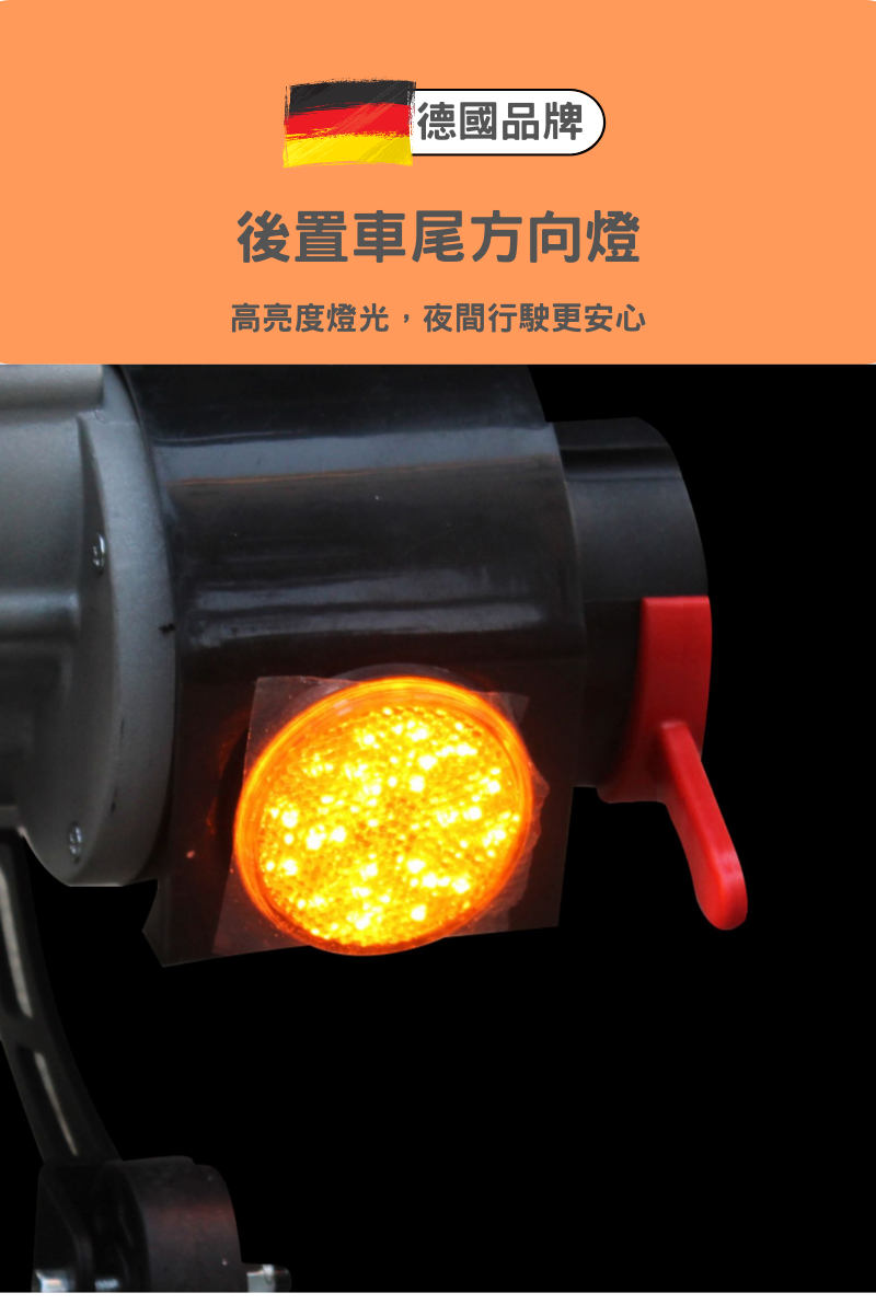 ● 前面左右配置安全反光燈,後面配置轉向燈光,保障用戶夜間出行安全。