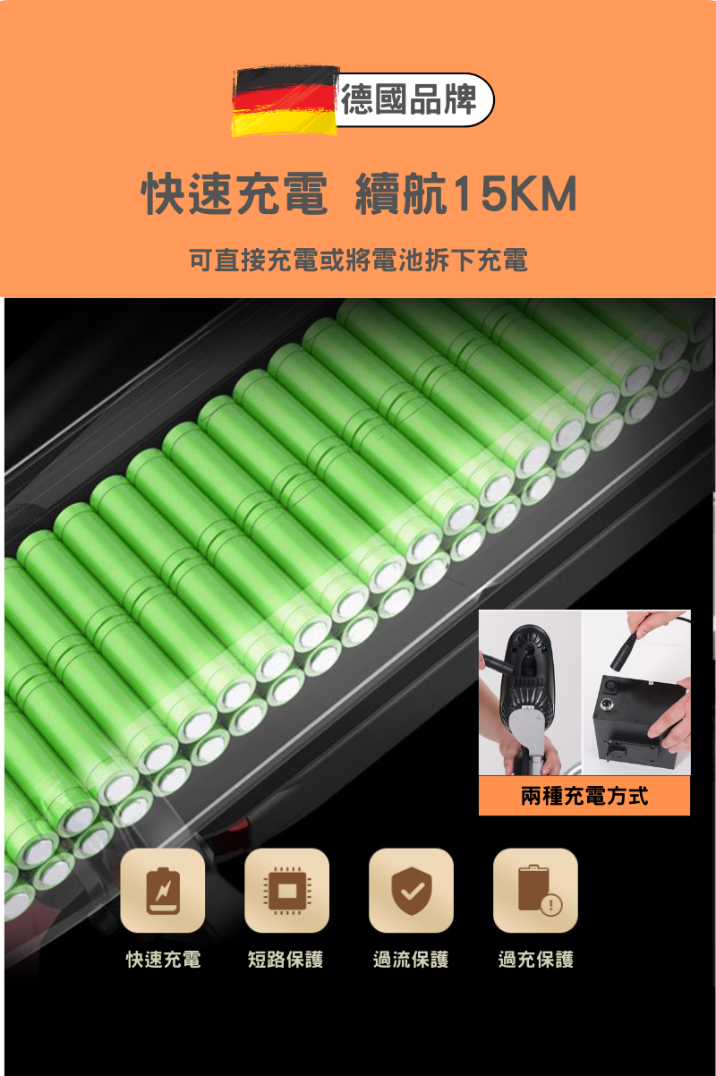 ● 充電時間6小時,續航15-20公里左右,電池採用快拆設計,可安全取出。