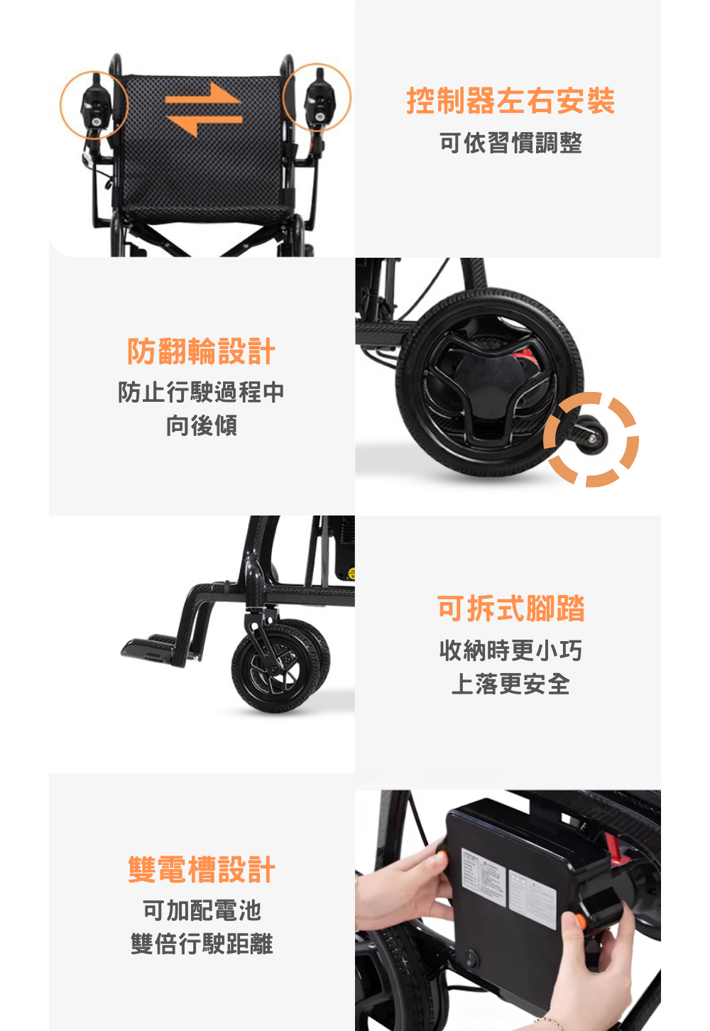 ● 整車配有防後翻設計,防止輪椅後翻,上斜更安全。
