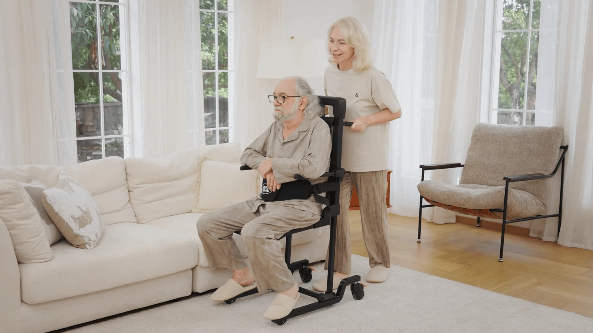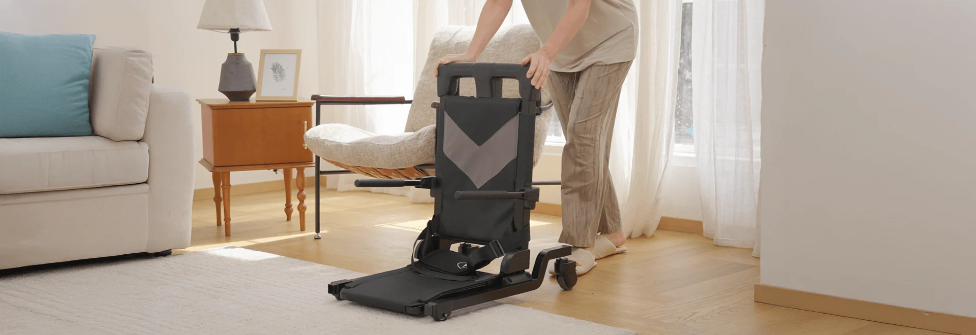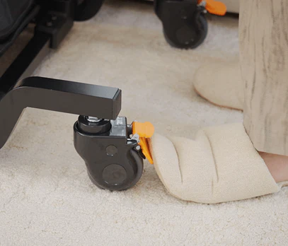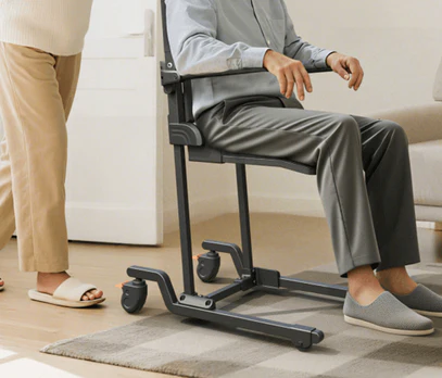 4 輪設計可在多種地板類型上滑動,方便在不同房間進行短距離轉移--無需人手扶抱,減輕使用者和護理人員的負擔。