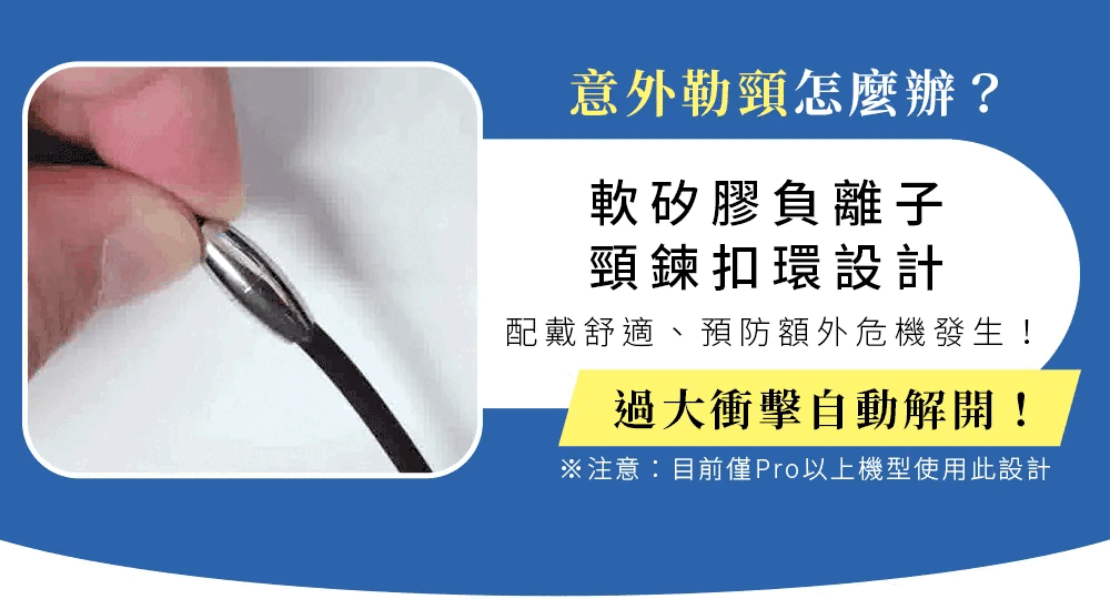 此款為第二代安照小護士,外型運動時尚。採取更優美簡潔的線條,搭配軟矽膠負離子項圈,及安全磁釦,輕盈的重量使佩戴者舒適無感,其簡約流暢的設計更獲得 2017年金點設計大獎。