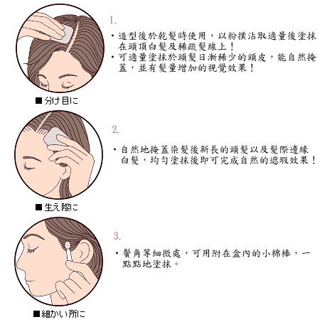 1. Step1:造型後於乾髮時使用,用粉撲沾取適量,塗抹在白髮及稀髮上,即可完成自然的遮瑕效果!