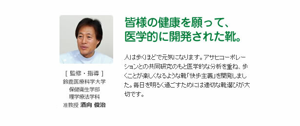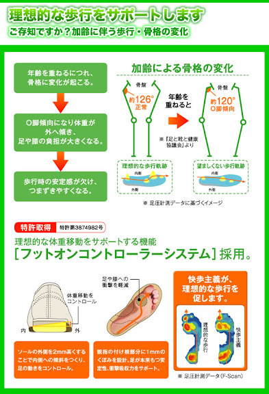本款散步鞋,是日本廠商為因應高齡化社會到來所特別設計的鞋款,由廠商與醫療法人松波綜合醫院及鈴鹿醫療大學共同開發。在設計上有諸多貼心的考量,尤其考量到年長者肌力及平衡感退化,因此在鞋頭上特別改良,並且採用輕量素材,以減少年長者走路跌倒的危險。