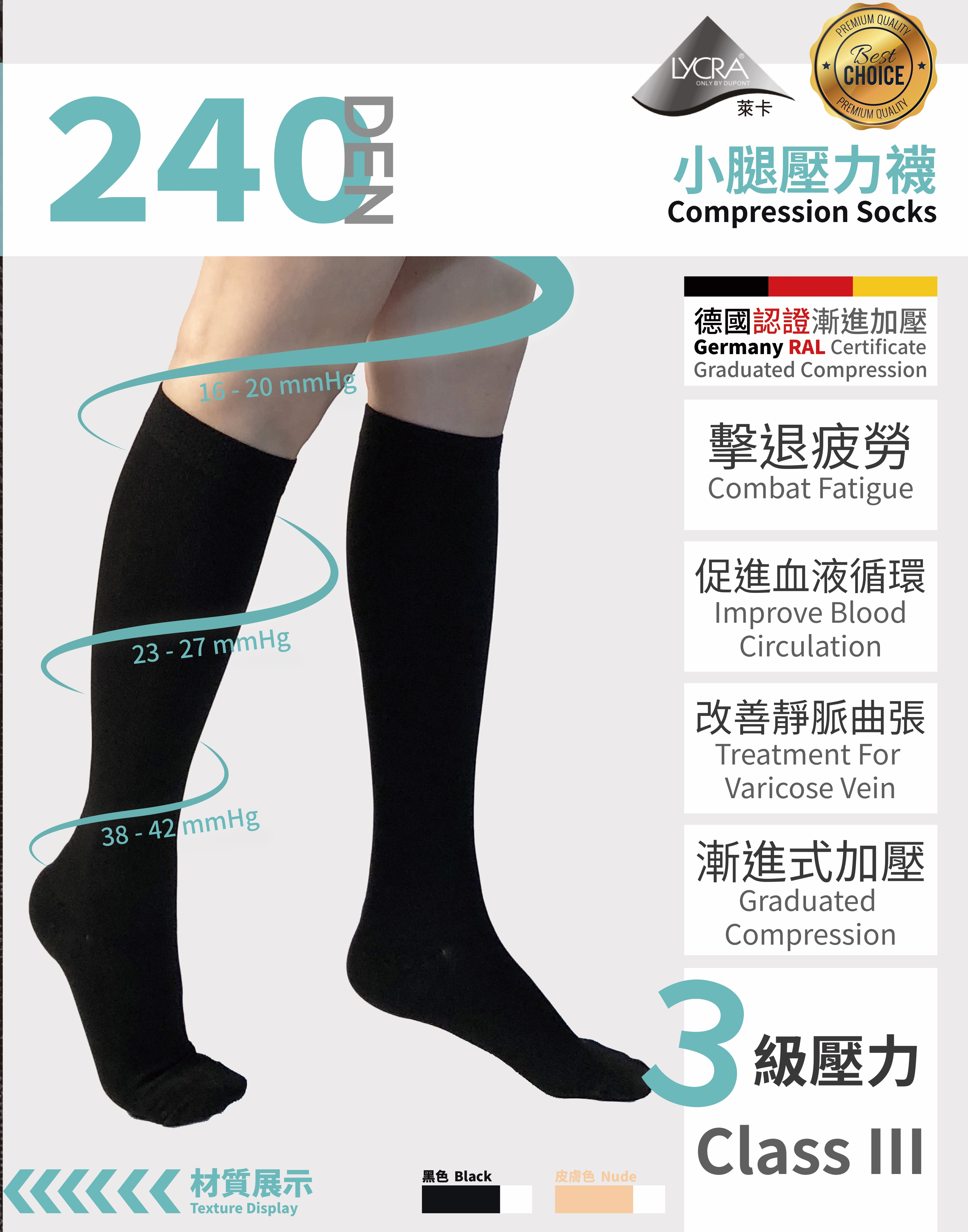 產品功能● 擊退疲勞● 促進血液循環● 改善靜脈曲張● 漸進式加壓產品特點● 世界權威德國漸進式壓力認證● 三段壓力設計, 分段小腿及腳踭壓力針對不同需要局部雕塑● 獨特織法固定肥肉● 無壓痕束口● 腳踭壓力較大, 更能舒緩腿部疲勞● 促進血液循環、改善腿部浮腫、預防靜脈曲張● 密趾設計, 舒服輕鬆● 外出及上班適用減輕從腳踝到腿部的壓力,使腿部感覺更輕巧。尺寸參考