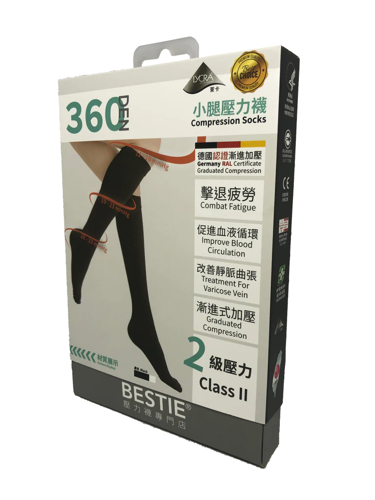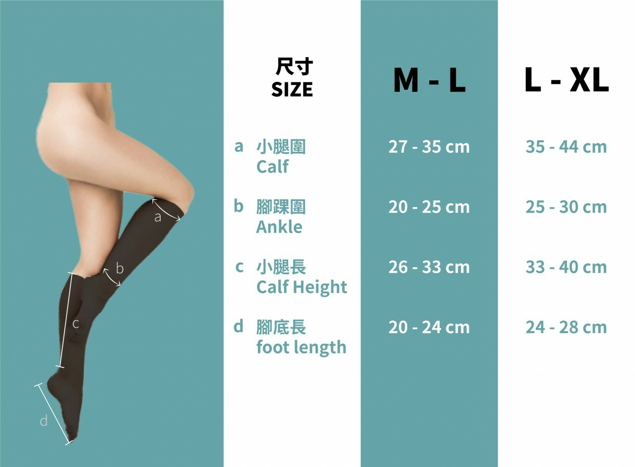產品功能● 擊退疲勞● 促進血液循環● 改善靜脈曲張● 漸進式加壓產品特點● 世界權威德國漸進式壓力認證● 三段壓力設計, 分段小腿及腳踭壓力針對不同需要局部雕塑● 獨特織法固定肥肉● 無壓痕束口● 腳踭壓力較大, 更能舒緩腿部疲勞● 促進血液循環、改善腿部浮腫、預防靜脈曲張● 密趾設計, 舒服輕鬆● 外出及上班適用減輕從腳踝到腿部的壓力,使腿部感覺更輕巧。尺寸參考