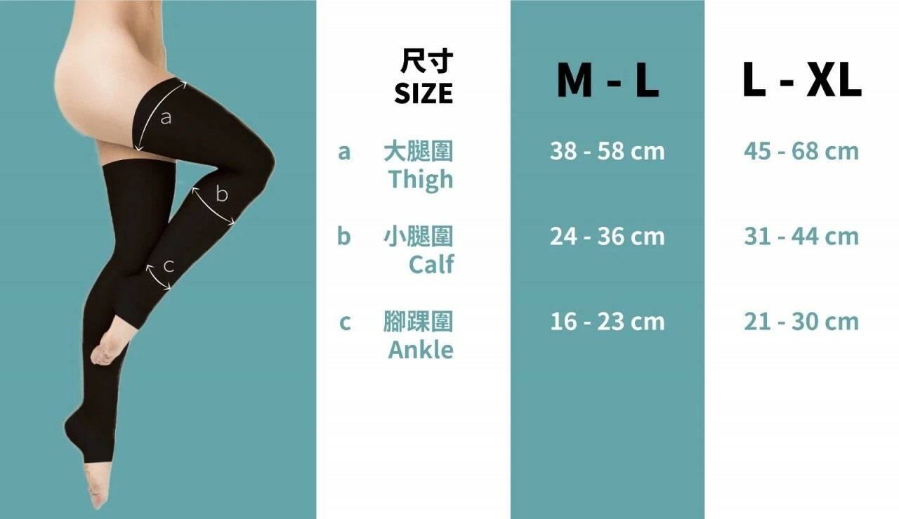 產品功能● 擊退疲勞● 促進血液循環● 改善靜脈曲張● 漸進式加壓產品特點● 世界權威德國漸進式壓力認證● 三段壓力設計, 分段大小腿針對不同需要局部雕塑● 獨特織法固定肥肉● 無壓痕束口● 下段壓力較大, 更能舒緩腿部疲勞● 促進血液循環、改善腿部浮腫、預防靜脈曲張● 舒服輕鬆● 外出及上班適用減輕從腳踝到腿部的壓力,使腿部感覺更輕巧。尺寸參考