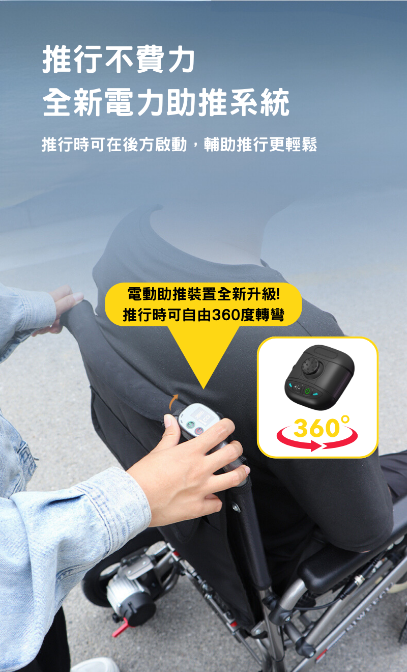 ● 整車配有防後翻設計,防止輪椅後翻,上斜更安全。