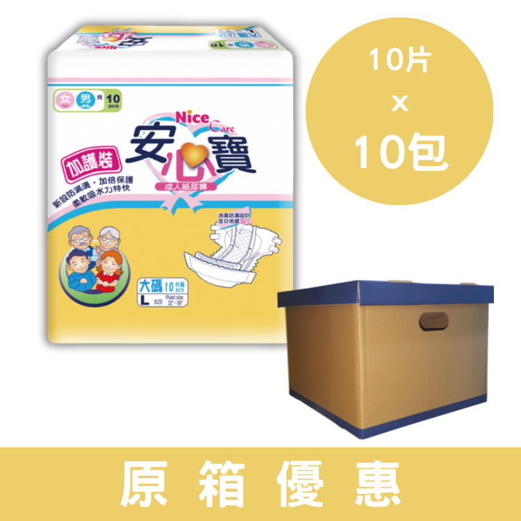 安心寶加護裝成人紙尿片 ,香港品牌, 特強吸水力,柔軟不織布表層, 貼身舒適,設尿濕顯示功能, 橡筋位防止水份於大腿位滲出,防菌除臭。