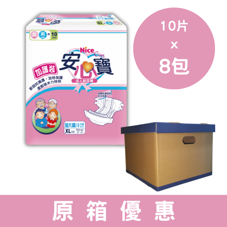 安心寶加護裝成人紙尿片 ,香港品牌, 特強吸水力,柔軟不織布表層, 貼身舒適,設尿濕顯示功能, 橡筋位防止水份於大腿位滲出,防菌除臭。